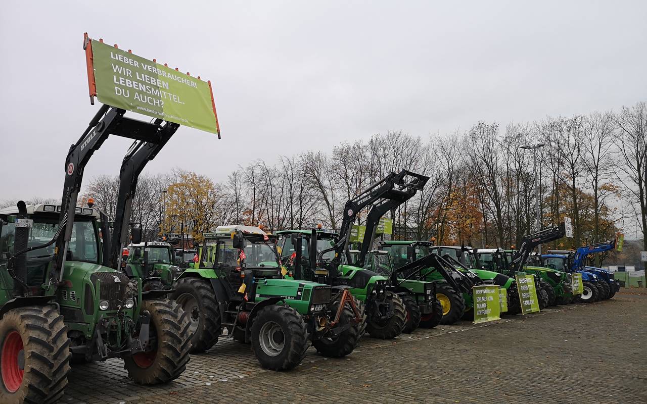 Die ersten 150 Trecker der Landwirte-Demo sind auf dem Parkplatz der Westfalenhallen angekommen. In einem vier Kilometer langen Konvoi sind die Traktoren mit 20 Stundenkilometern über Landstraßen von Unna nach Dortmund gefahren. Am Remydamm wollen sie sich später mit weiteren Landwirten zu einer Protestkundgebung treffen.