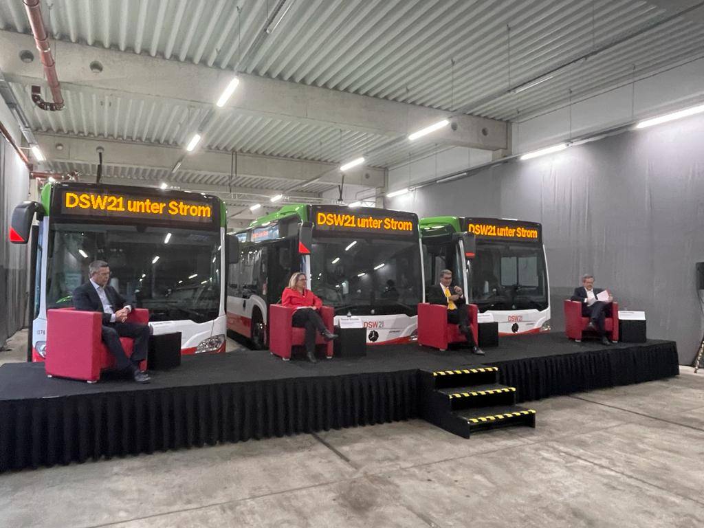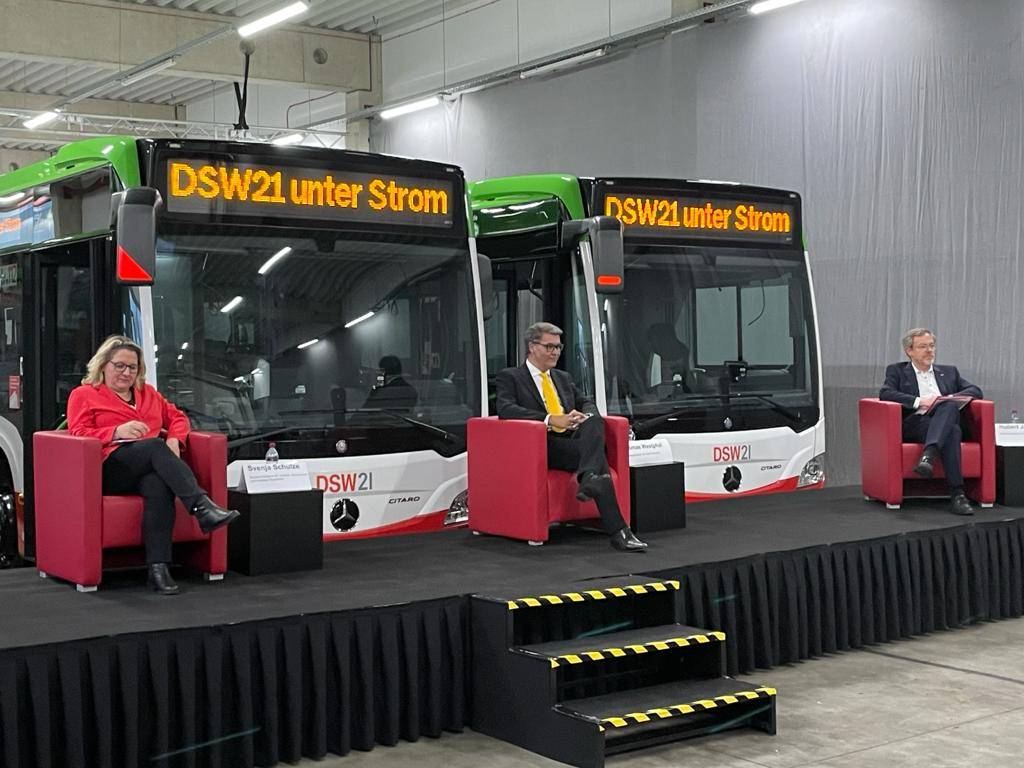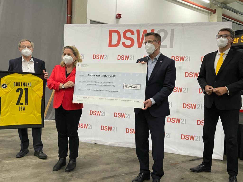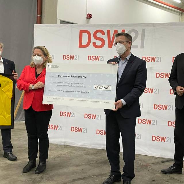 Ab Sommer kommenden Jahres schicken die Dortmunder Stadtwerke 30 Elektrobusse auf die Straßen. Für die Anschaffung hat Bundesumweltministerin Svenja Schulze am Mittwoch einen Scheck an die DSW21 und Oberbürgermeister Thomas Westphal überreicht.