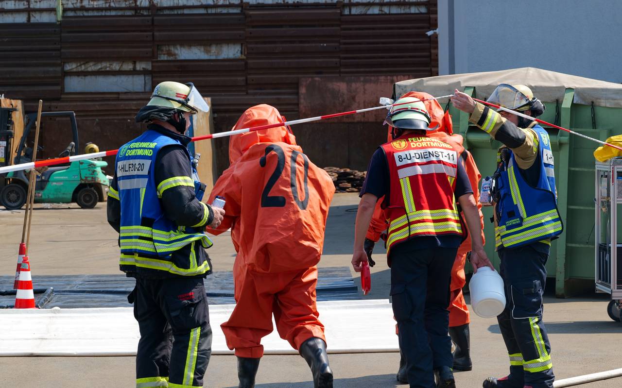 Spezialeinsatz der Feuerwehr am Dortmunder Hafen: In einem Entsorgungsbetrieb ist ein gefährlicher Stoff ausgelaufen.