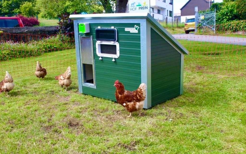 Fünf Hühner passen den transportablen grünen Hühnerstall, wenn jemand die Hühner mietet. Innen befindet sich eine Stange für die Hühner zum schlafen und ein abgetrennter Bereich zum Eier legen. Auf dem Dach der Schriftzug: "Agathe kommt". So heißen im Prinzip alle Hühner bei den Preins.