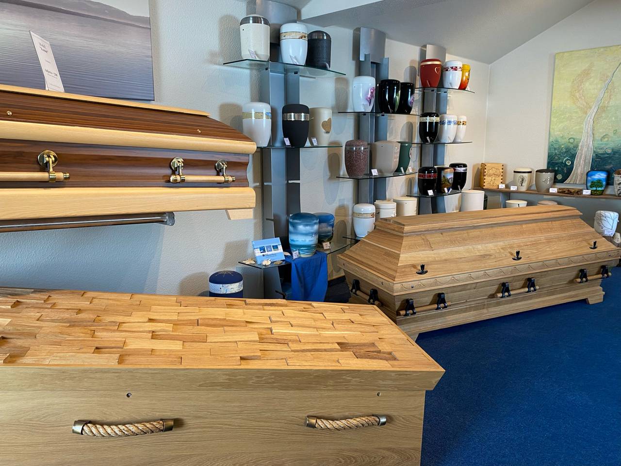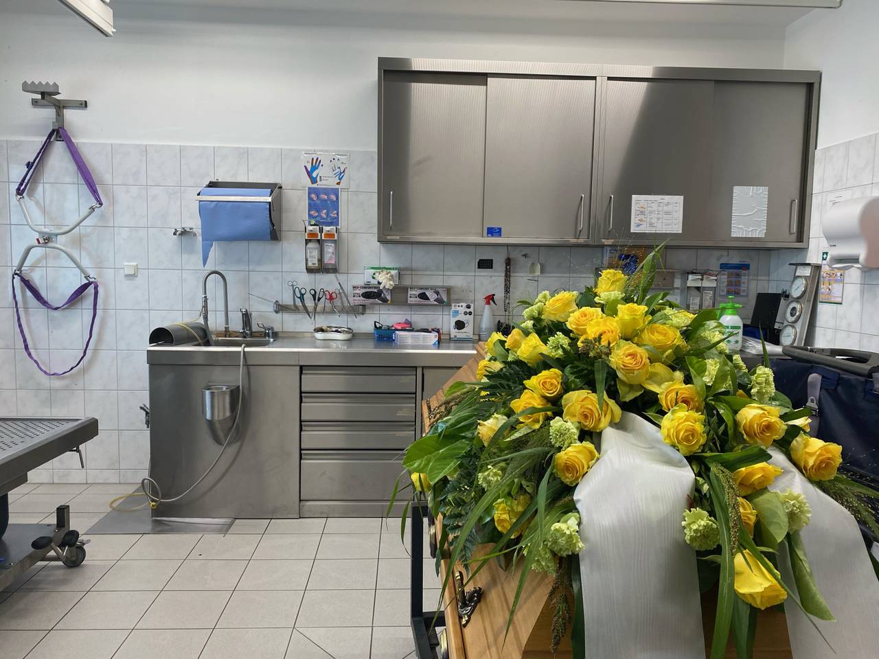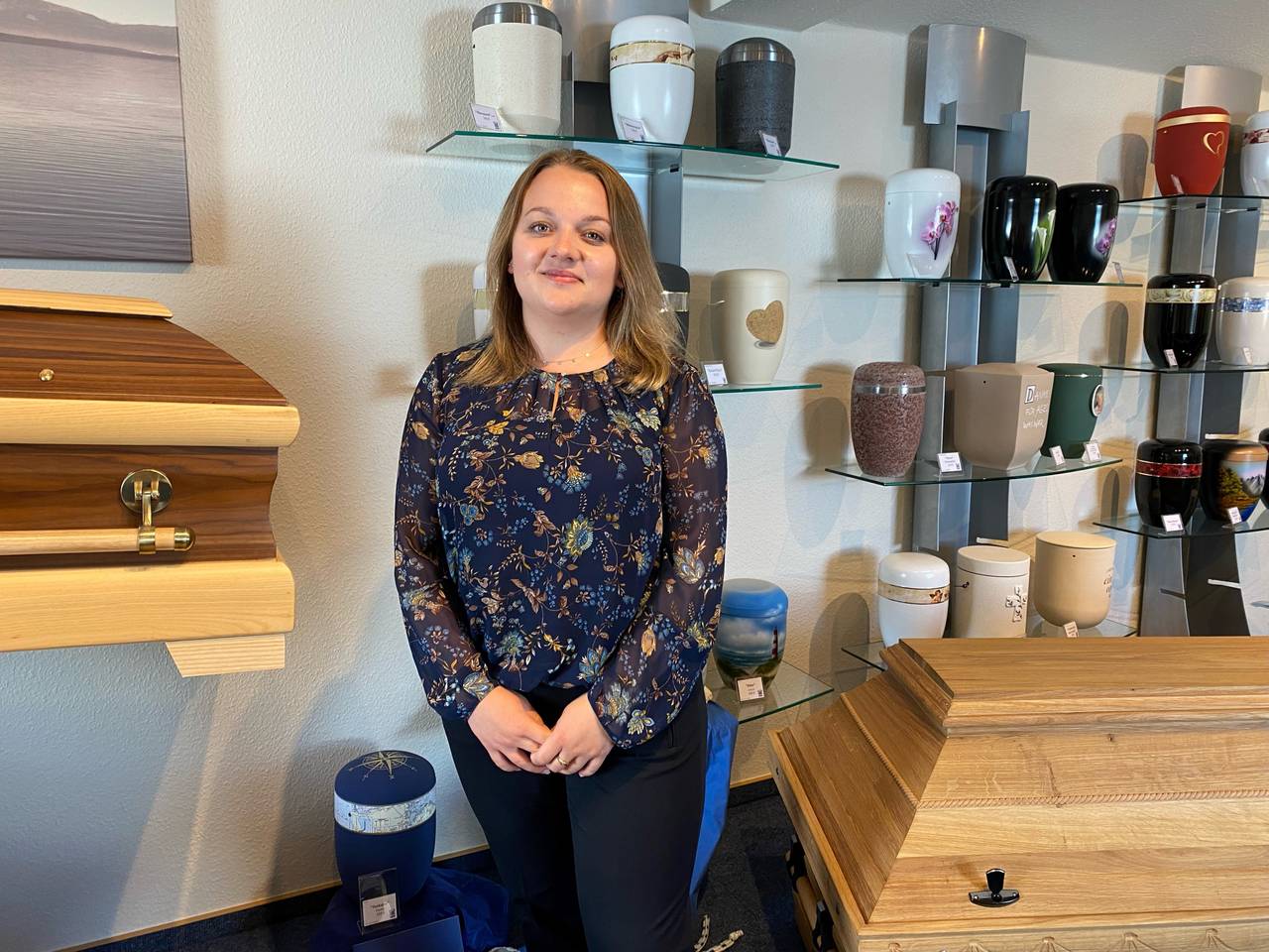 Die Trauermusik läuft, Kerzen brennen und vorne steht die Urne: Ungefähr 10 Tage sind es vom Tod bis zur Trauerfeier, erklärt Bestatterin Julija. Sie hat beim Bestattungshaus Schäfer mit 19 ihre Ausbildung angefangen und ist bis heute geblieben.