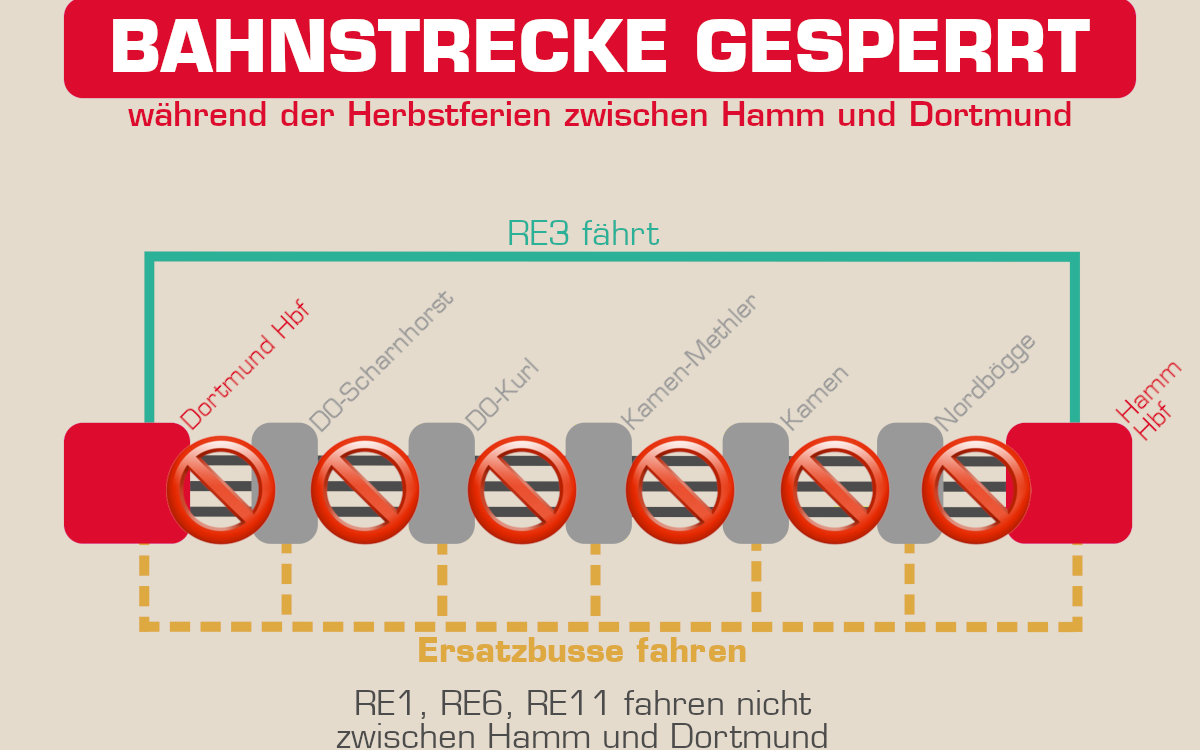 In Hamm baut die Bahn eine neue Schallschutzwand vom Friedhofsweg bis zur Weetfelder Straße. Dadurch können die Regionalexpress-Linien RE1, RE11 und RE6 nicht zwischen Hamm und Dortmund fahren. Als Ersatzzug wird der RE 3 eingesetzt. Von Hamm fährt er weiterhin einmal die Stunde, und dann über eine Umleitung direkt nach Dortmund.