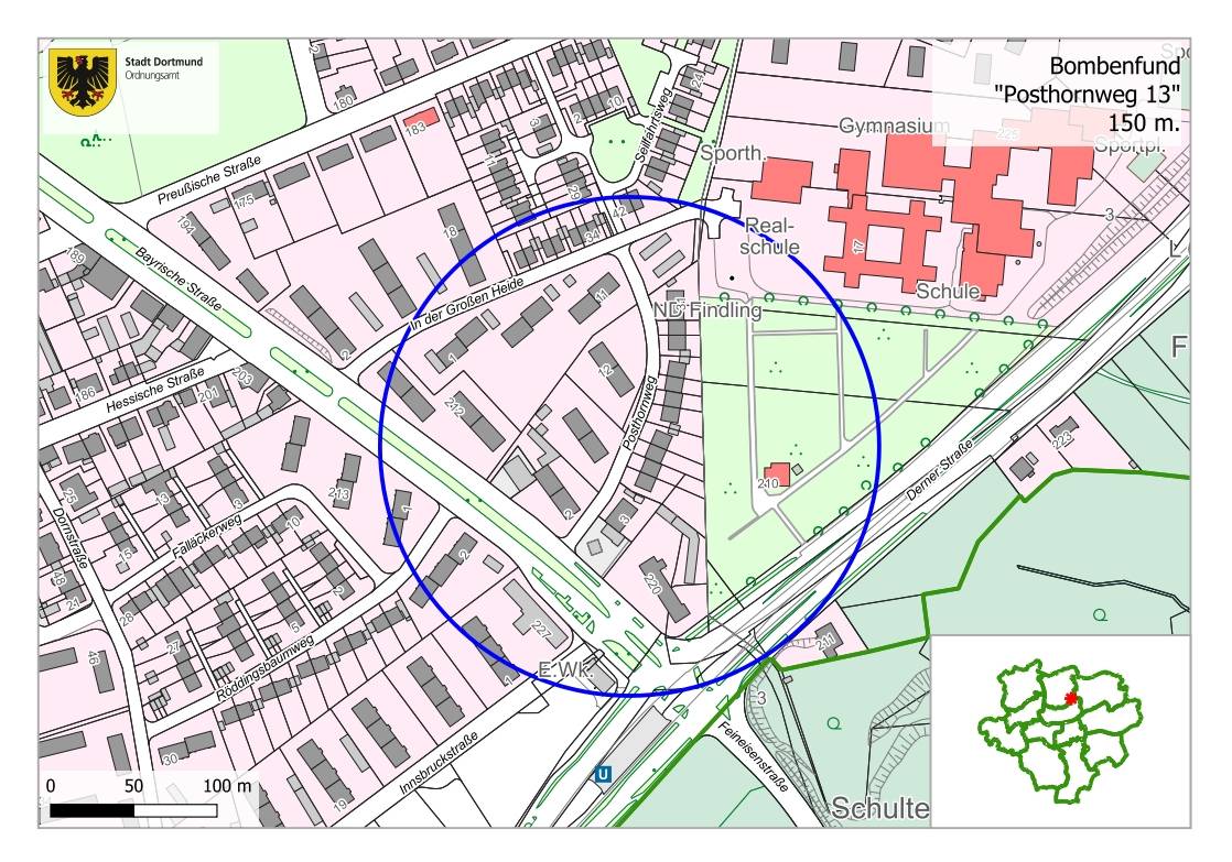 Im Posthornweg in Eving wurde heute (16.10) ein amerikanischer 50-Kilogramm-Blindgänger aus dem Zweiten Weltkrieg gefunden. Für die Entschärfung wird das umliegende Gebiet in einem Radius von 150 Metern ab 15 Uhr evakuiert.