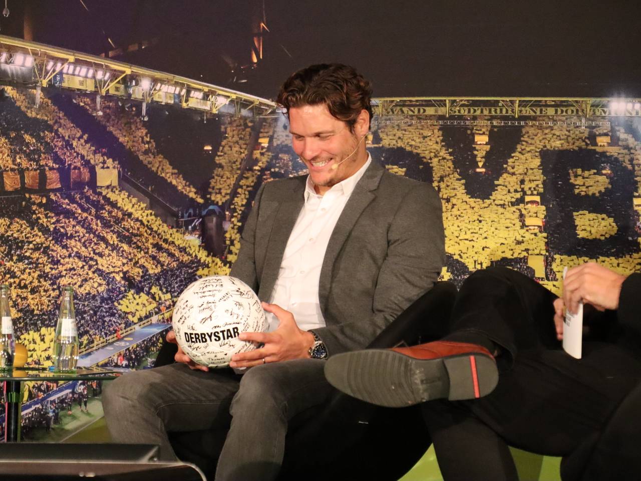 Die Zuschauer hatten dieses Mal eine besondere Möglichkeit sich in das Gespräch mit einzubringen, denn vorab konnten sie ihre Fragen an den Trainer einsenden. Die interessantesten unter ihnen schafften es dann in den Talk und kein geringerer als Edin Terzic höchstpersönlich nahm sich den Fragen der Fans an. Welche besonderen Rituale hat Terzic vor einem Spiel, wie hätte der Trainer einen Wechsel von Ronaldo zum BVB gefunden oder die Frage, ob er denn jemals zu den Bayern gehen würde, der sehr offen und sympathische Cheftrainer nahm sich Zeit für jede einzelne Frage und scheute sich nicht vor tiefgründigen Diskussionen und Fragen zu seiner Person. Die ausgelassene Atmosphäre im Innenhof des Lensing Caree sorgte für einen kurzweiligen Abend mit vielen Lachern und einiger fußballerischer Fachsimpelei. Die Schlusspointe gab kein geringerer als Borussen Bernie, bekannt aus der Pöhlervorschau, er gab dem Cheftrainer noch einige lobende Worte in einer Videobotschaft mit auf den Weg. Zudem haben sich Radio 91.2 und die Ruhrnachrichten noch eine ganz besondere Aktion ausgedacht, alle anwesenden Zuschauer durften auf einem Ball unterschreiben, der an Terzic überreicht wurde.