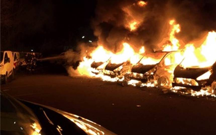 Insgesamt hatten dort 30 Fahrzeuge der Firma "Flaschenpost" geparkt. Die Polizei geht von Brandstiftung aus. Sie schätzt die Schadenshöhe auf 180.000 Euro.