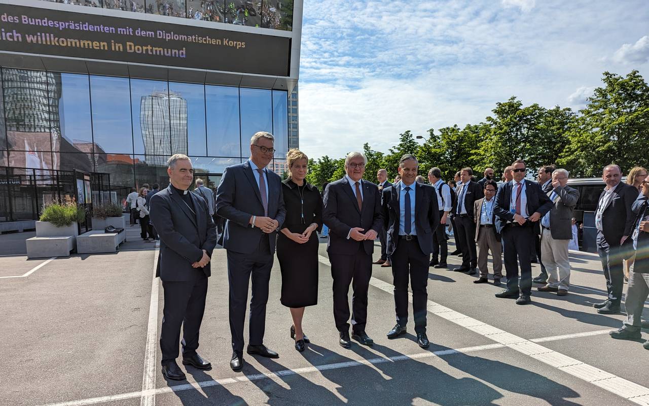 Bundespräsident Frank-Walter Steinmeier ist in Dortmund zu Besuch. Gemeinsam mit 150 Botschaftern aus der ganzen Welt schaut sich Steinmeier im Deutschen Fußballmuseum eine Ausstellung an.