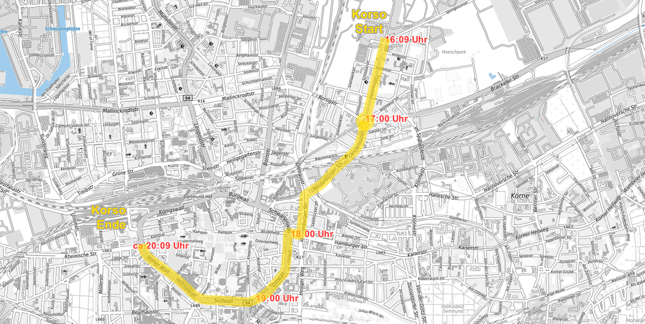 Sollte der BVB gewinnen, gäbe es am Sonntag, dem 2. Juni, noch einen Korso um den Borsigplatz. Er würde dann um kurz nach 16 Uhr starten. Die Route lässt sich online schon einsehen. Im Londoner Wembley-Stadion trifft der BVB am 1. Juni im Champions-League-Finale auf Real Madrid.