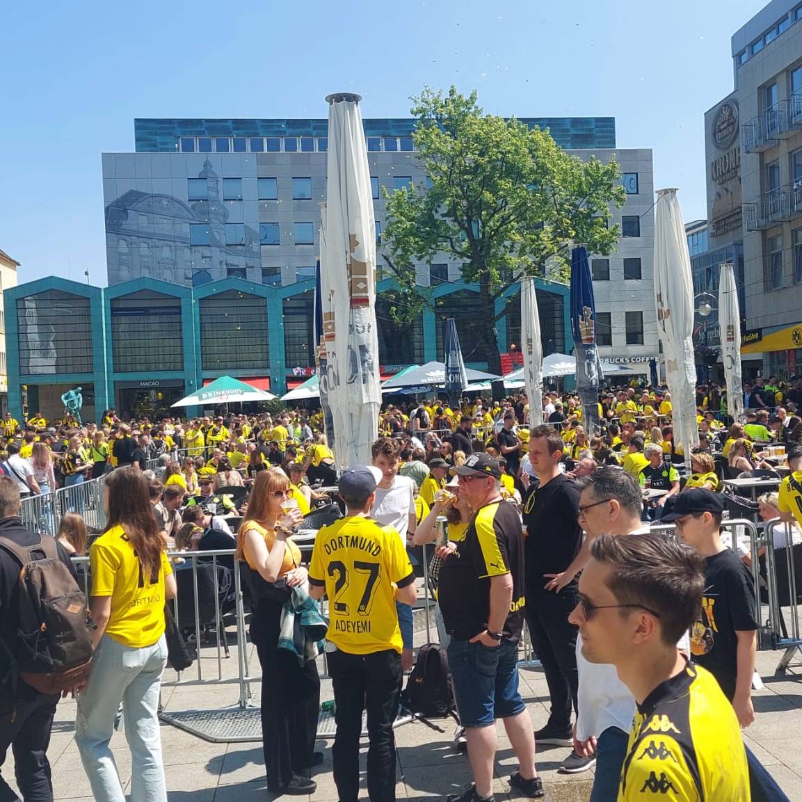 Auf dem traditionellen Treffpunkt,dem Alten Markt, bilden sich bereits seit heute Morgen meterlange Schlangen. Wie vor der Kneipe Wenkers am Markt. Die Schlange geht bis zur Reinoldikirche. Die Stimmung ist ausgelassen, es werden BVB-Hymnen gesungen und die schwarz-gelben Fahnen geschwenkt. Sollte der Alte Markt allerdings zu voll werden, wird er aus Sicherheitsgründen abgesperrt.