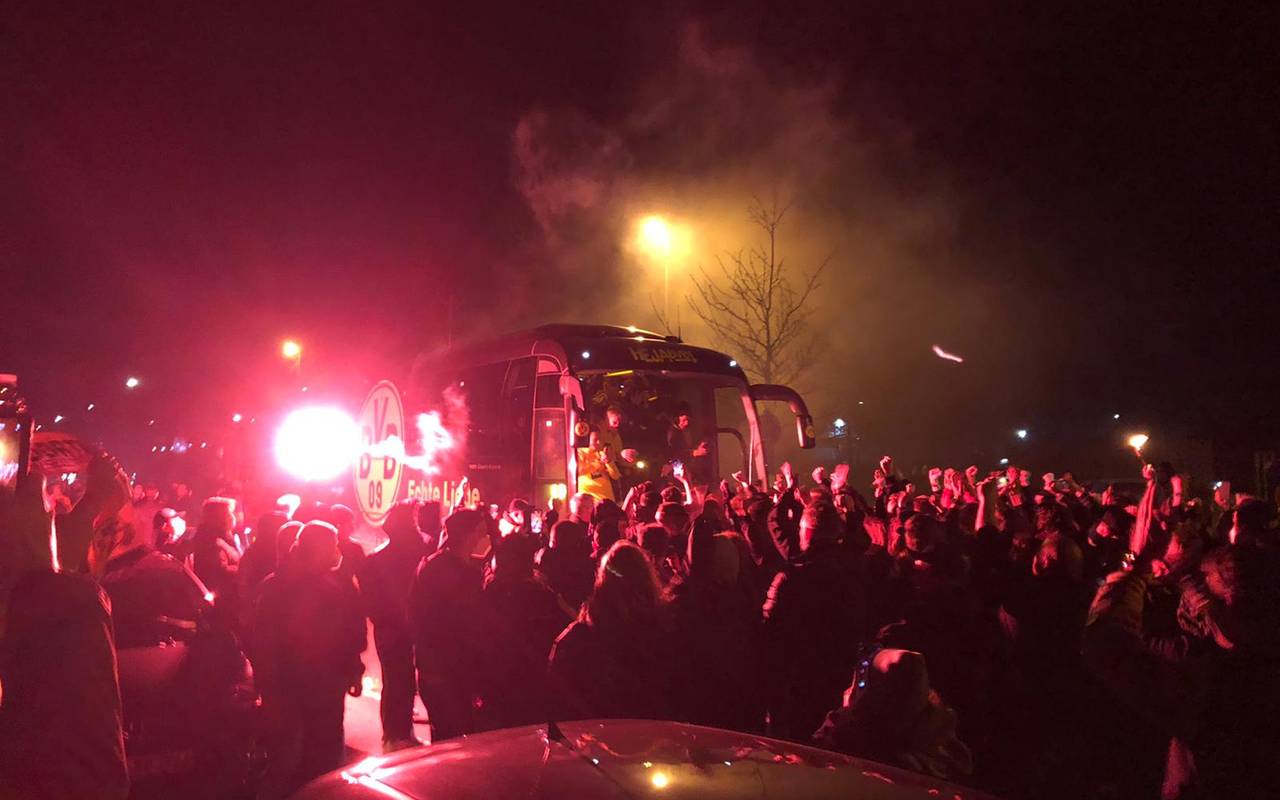 Nach dem 4 zu 0 Sieg gegen Schalke am Samstag hatten gut 200 BVB-Anhänger die Mannschaft empfangen und frenetisch gefeiert. Ohne Abstand und Maske, dafür aber mit Bengalos hatten sie die Mannschaft am Trainingsgelände in Brackel begrüßt.