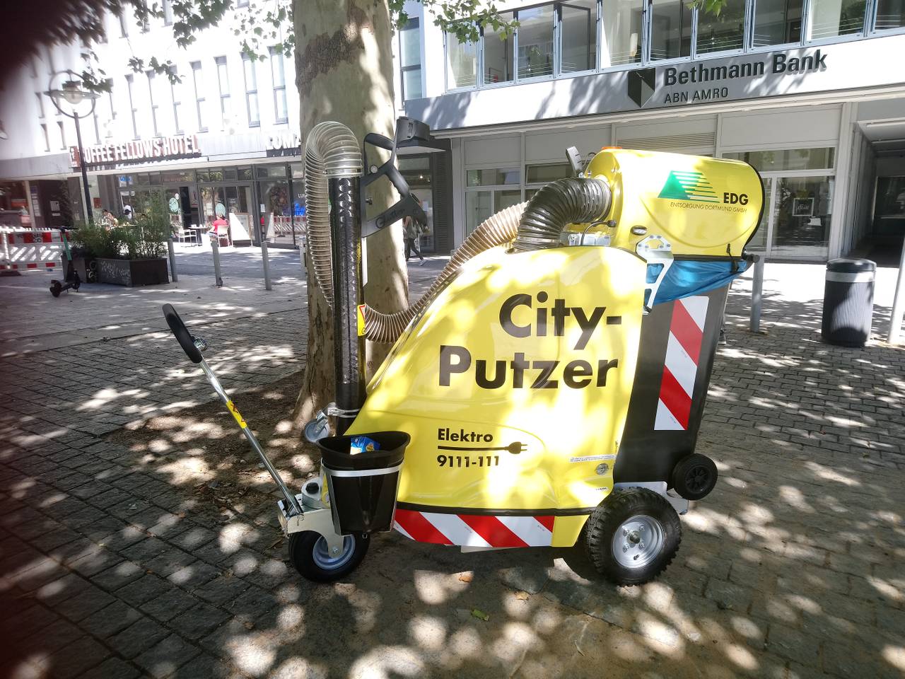 Er ist quietschgelb, mannshoch und sieht aus wie ein überdimensionaler Staubsauger: der neue EDG City-Putzer. Steffi Strecker war mit dem City-Putzer auf Tour.