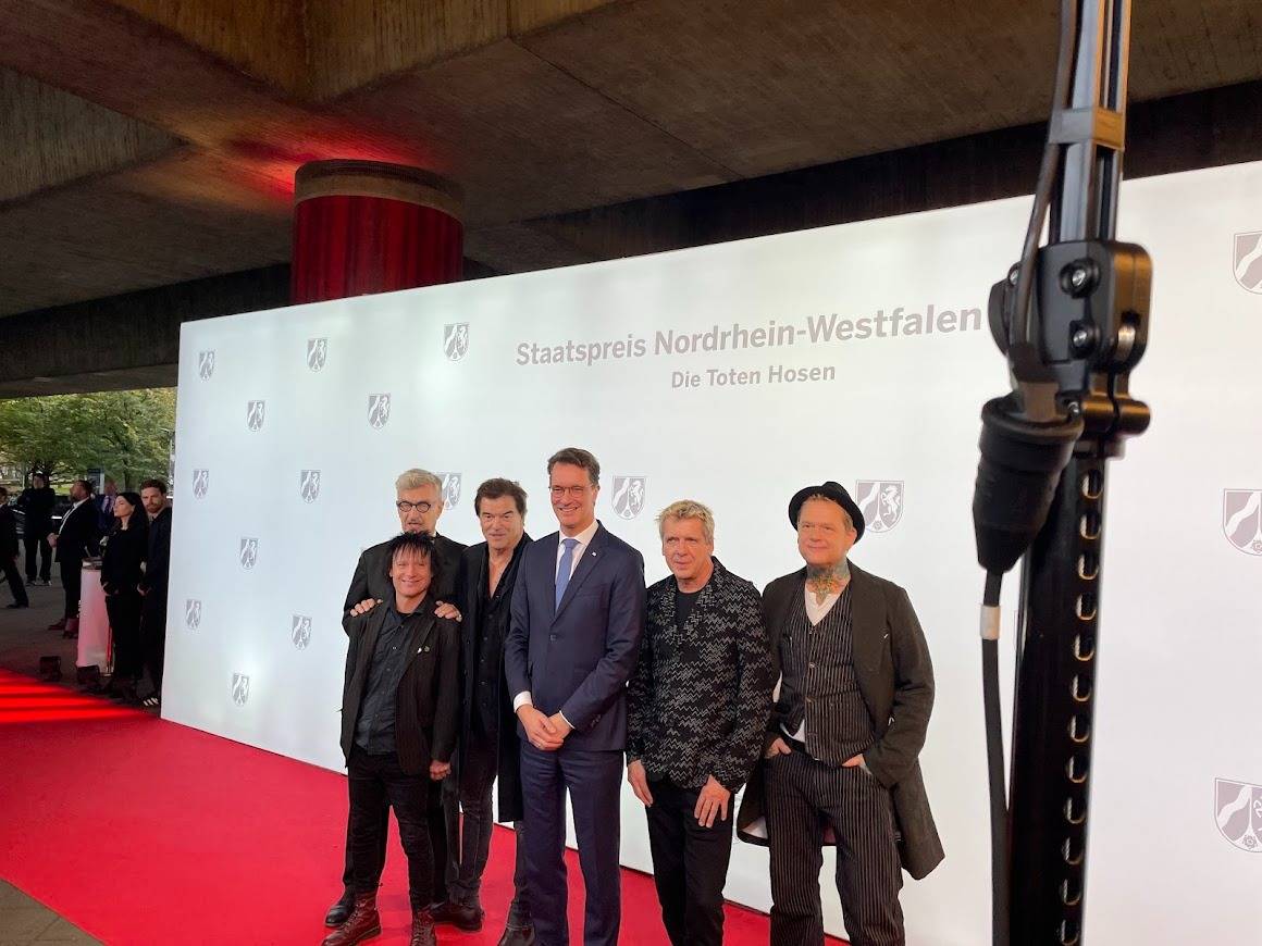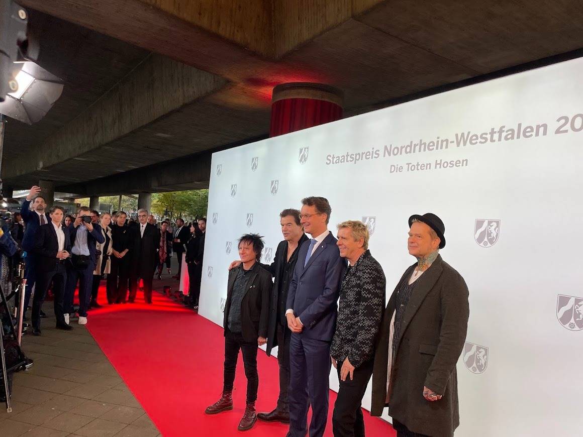Die Toten Hosen und NRW-Ministerpräsident Hendrik Wüst auf dem rote Teppich. Die Toten Hosen bekommen den NRW-Staatspreis für  ihr kulturelles Lebenswerk und für ihre sozialen Einsatz.