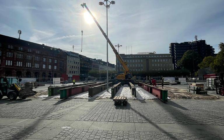 Auf dem Hansaplatz wird am Dienstag (19.10.) der Grundstein für den Dortmunder Weihnachtsbaum gelegt. Die großen Stahlträger für das Gerüst sind bereits geliefert. Es soll bis Anfang November gebaut werden. Danach werden 1.700 Rotfichten daran befestigt.