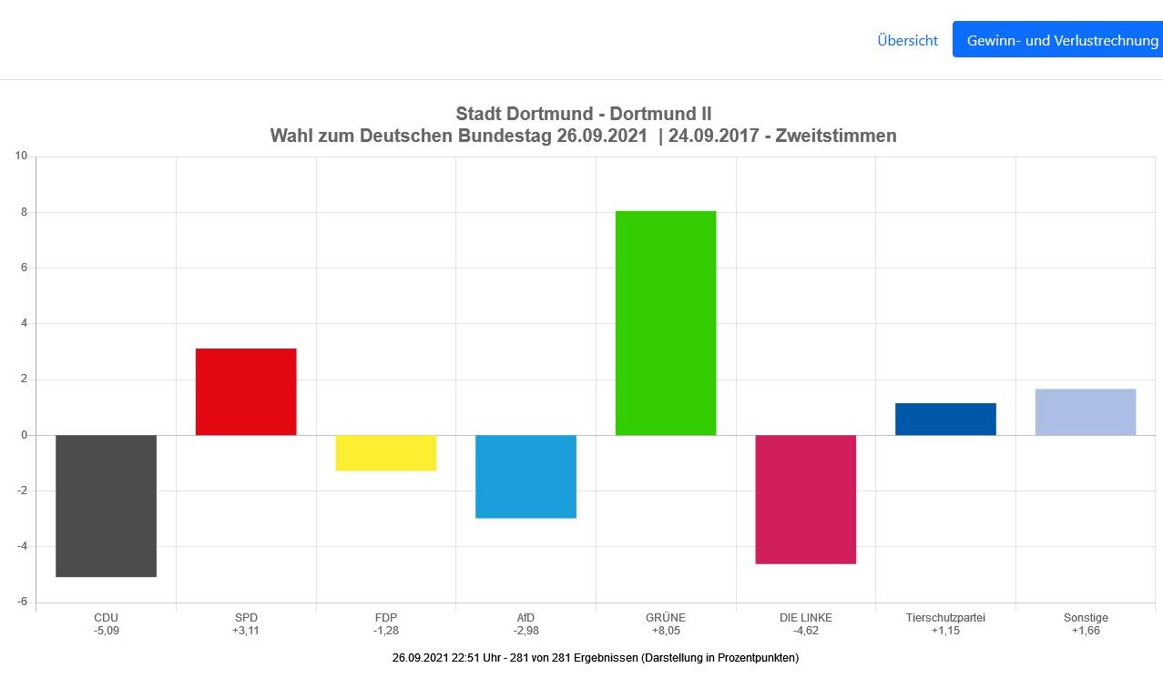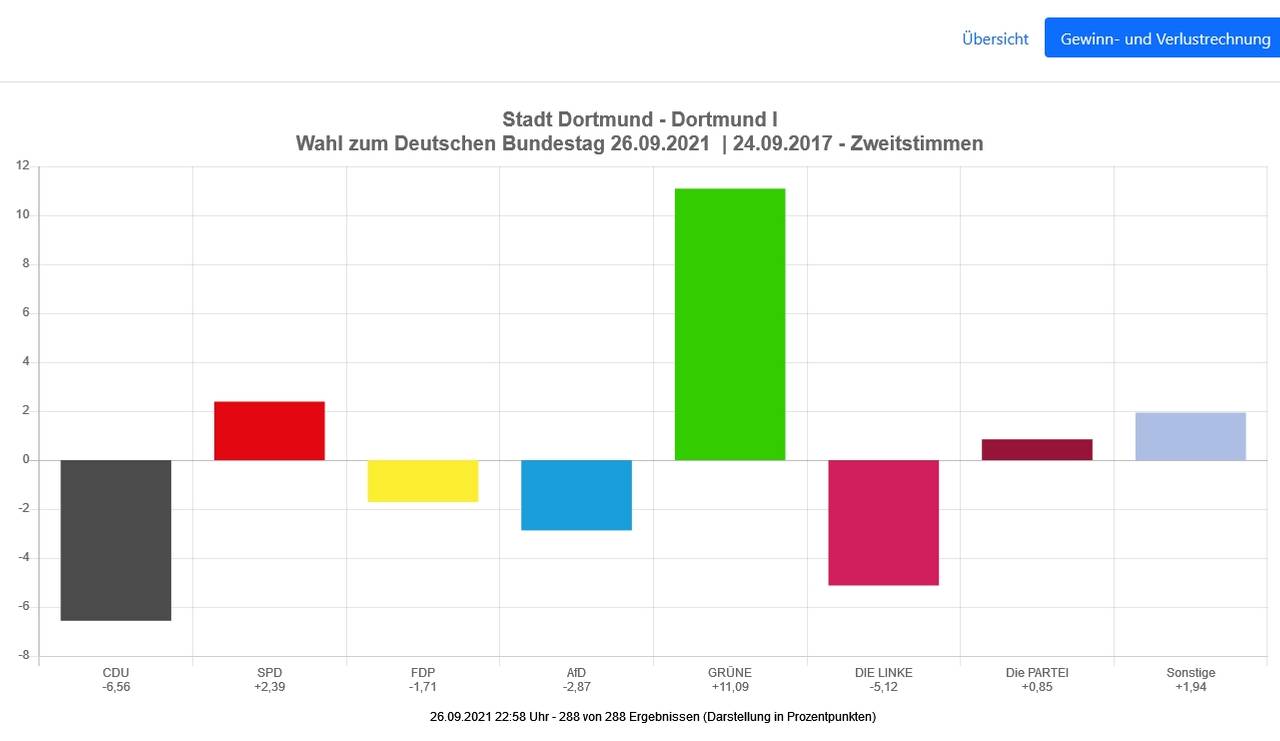 Die CDU verliert sechs Prozentpunkte und holt mit rund 19 Prozent ein historisch schlechtes Wahlergebnis. Mit fast zehn Prozentpunkten sind vor allem die Grünen die Gewinner, sie sind mit 18 Prozent in Dortmund drittstärkste Kraft. Auch bei den Erststimmen für die Direktmandate liegt die SPD klar vorn.