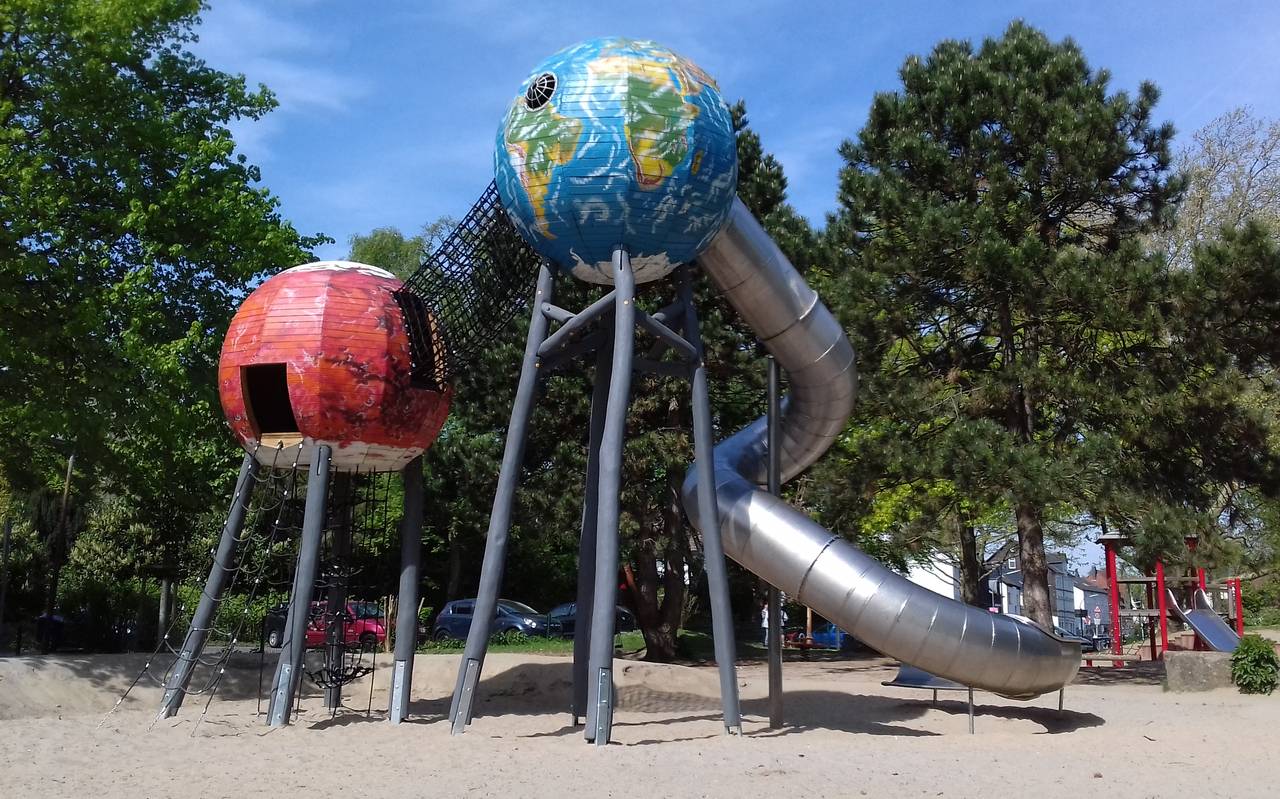 Hier steht der Kletterspaß an erster Stelle. Für Kinder jeden Alters gibt's hier viele verschiedene Klettermöglichkeiten. Aber natürlich hat der Spielplatz auch noch eine Menge mehr zu bieten: eine Rutsche, ein Klettergerät mit Rutsche, eine Röhrenrutsche, eine Sandfläche, ein Wasserspiel (perfekt zum Matschen), ein Federwippgerät, eine Wackelbrücke, ein Balancier-Element, ein Hangelgerät, einen Basketballkorb und eine Tischtennisplatte.