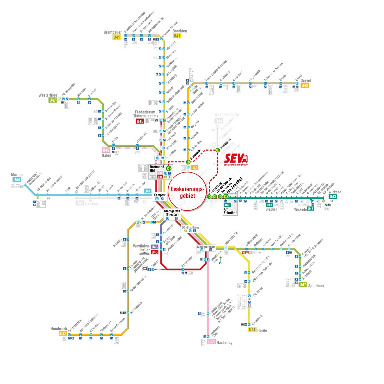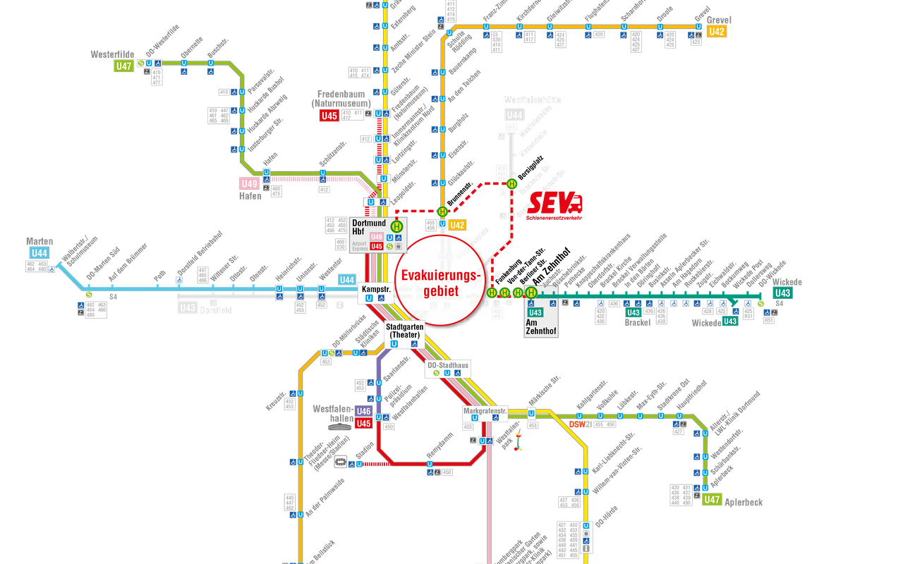 - Um die unterbrochenen Stadtbahnlinien miteinander zu verbinden, richtet DSW21 mit Beginn der Entschärfung einen Schienenersatzverkehr mit Gelenkbussen etwa im Acht-Minuten-Takt ein.