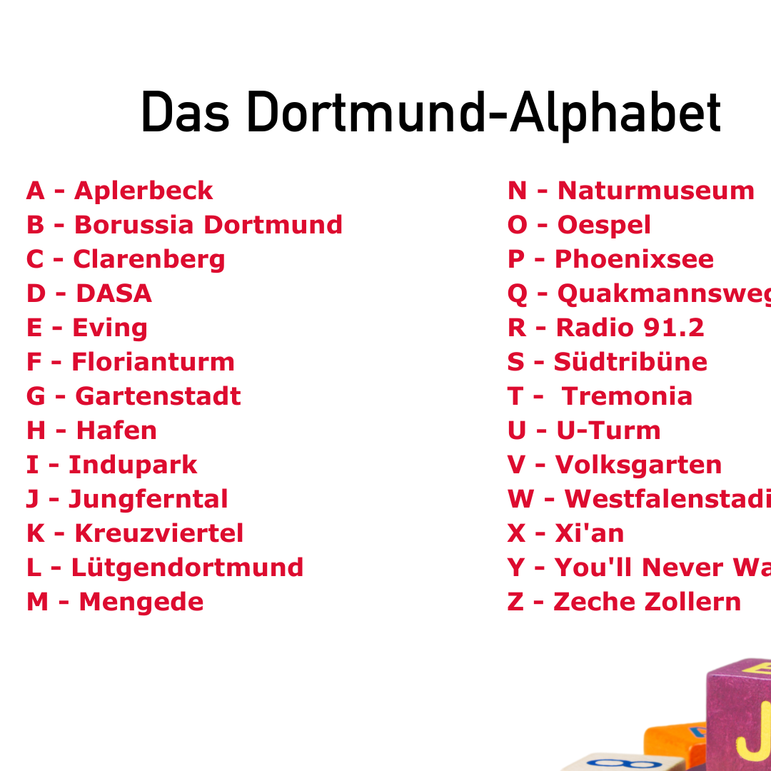Wir haben gemeinsam mit euch ein Dortmunder Buchstabieralphabet gemacht! Ihr habt uns fleißig Ideen über Facebook geschickt. Bei einigen Vorschlägen konnten wir uns nicht entscheiden. Deshalb habt ihr uns geholfen, das Alphabet per Abstimmungen zu vervollständigen. Hier ist das Ergebnis ![]()