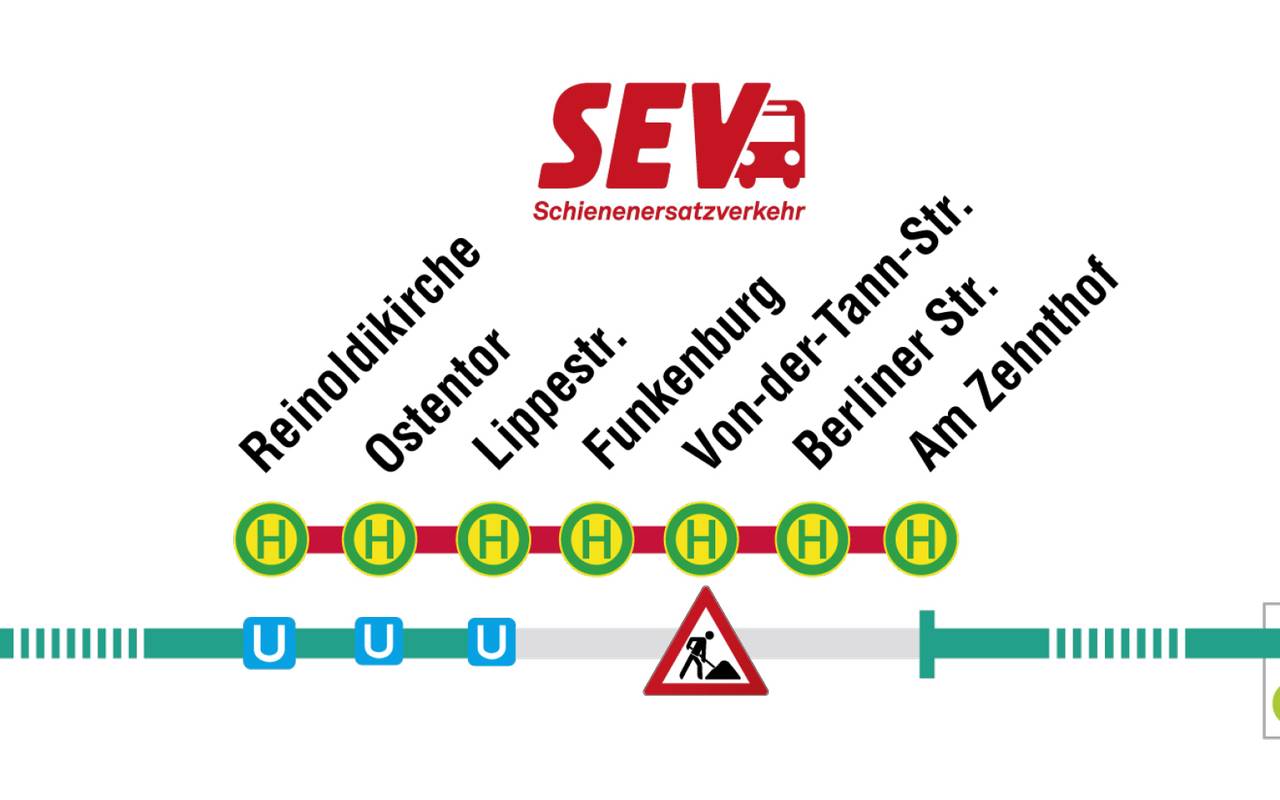 Richtung Dorstfeld gibt es die Ersatzhaltestelle Hallesche Straße. In Fahrtrichtung Körne/Wickede sind die Ersatzhaltestellen für die Haltestellen »Funkenburg« und »Berliner Straße« auf der Klönnestraße bzw. der Berliner Straße. Mobilitätseingeschränkte Fahrgäste können während dieser Zeit das Fahr- und Servicepersonal ansprechen, wenn sie Unterstützung benötigen. Weitere Informationen gibt es hier.