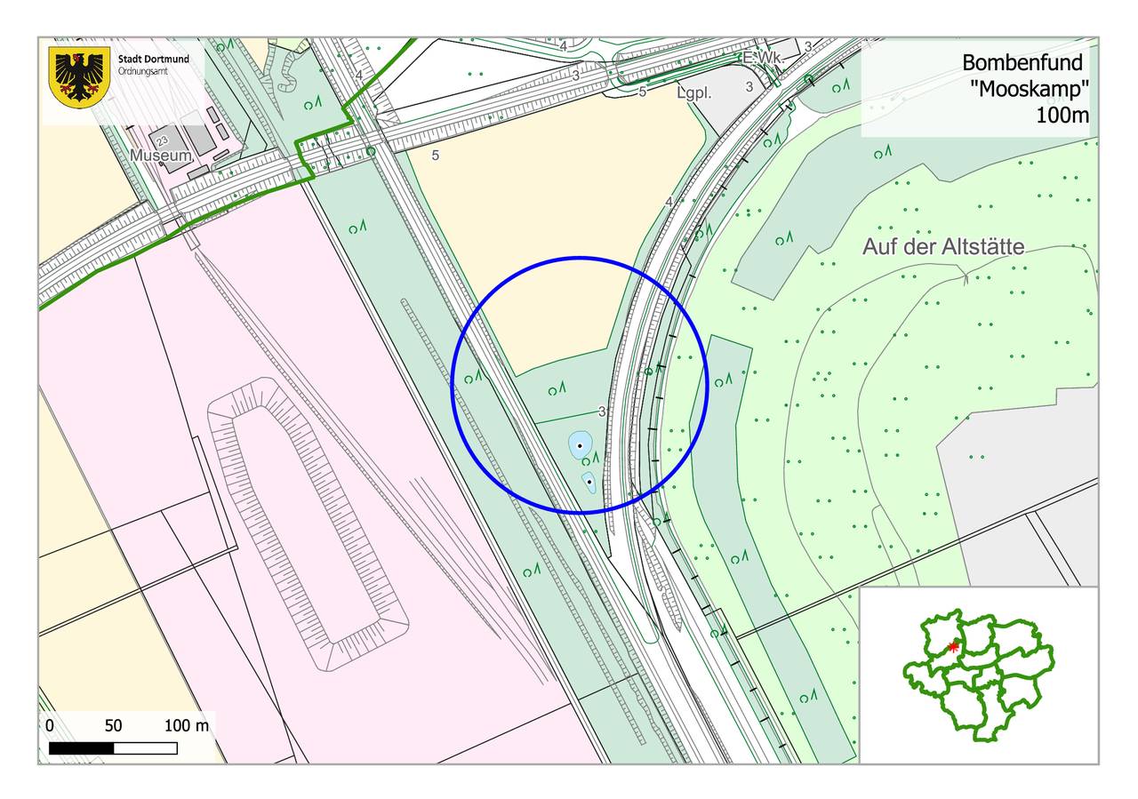In Mengede wurde heute Vormittag ein Blindgänger gefunden. Die 125 Kilo Bombe wurde im Bereich Mooskamp entdeckt und muss noch heute gesprengt werden. Weil sie beschädigt ist, könne sie nicht abtransportiert werden, sagt die Stadt. Die Stadt sperrt einen 100 Meter Radius um den Fundort ab 13 Uhr. Anwohner oder Firmen müssen zwar nicht evakuiert werden, aber eine ICE-Strecke liegt im Radius. Der Zugverkehr wird während der Entschärfung eingestellt. Außerdem kann es sein, dass durch die Sprengung zwischen 13 und 14 Uhr ein Knall zu hören sein wird.