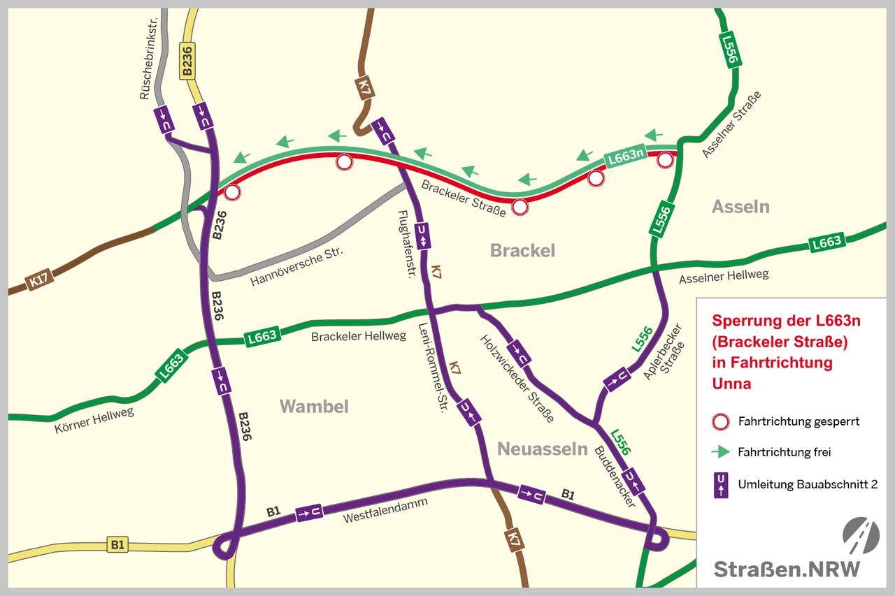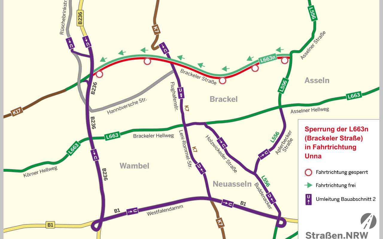 Die Schnellstraße zwischen B236 und Asselner Straße bekommt eine neue Fahrbahndecke. Das wird ärgerlich für Pendler und für alle, die ins dortige Gewerbegebiet wollen. Auf der Brackeler Straße haben sich Schlaglöcher und Risse gebildet. Deshalb wird sie in den Sommerferien erst drei Wochen lang stadteinwärts gesperrt, dann drei Wochen stadtauswärts. Betroffen sind zum Teil auch die Verbindungen zur B236. Es gibt Umleitungen für Autofahrer und die Buslinien. Straßen.NRW lässt sich die Bauarbeiten 3,7 Millionen Euro kosten. Die Straße nicht voll zu sperren, sondern den Verkehr einspurig an der Baustelle vorbeizuführen, sei keine Option gewesen. Dann würden die Arbeiten rund ein Jahr dauern.