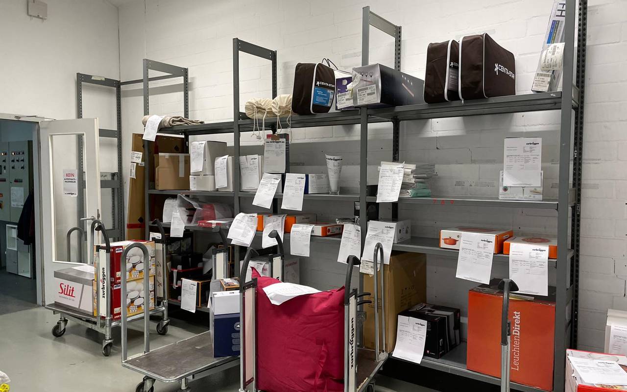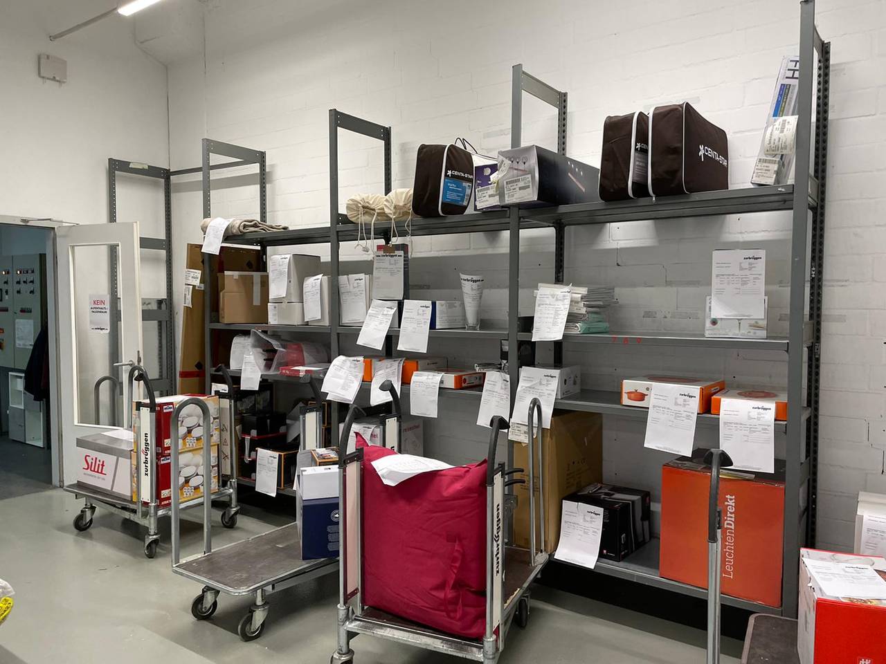 Möbel sind für Click und Collect-Kunden nicht sehr interessant. Vor allem handliche Waren im niedrigen Preissegment werden gut über Click und Collect gekauft, sagt Zurbrüggen-Hausleiter Stefan Struck. Diese Artikel befinden sich in der 1. Etage des Möbelhauses. Dort suchen zwei Azubis die bestellte Ware raus und deponieren sie auf einem großen Rollwagen. Der Rollwagen geht dann ins benachbarte Gebäude, wo sich das separate Abhollager befindet.