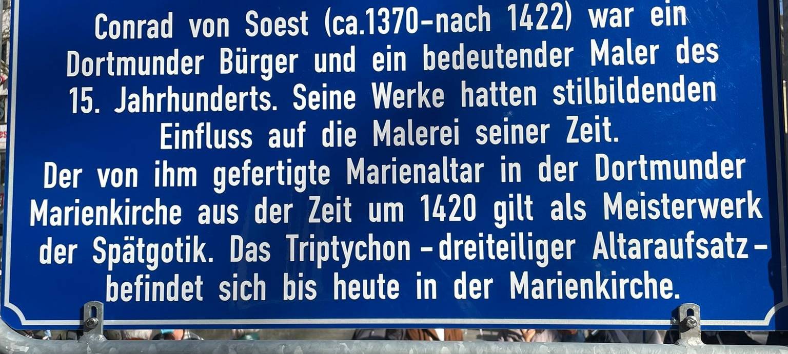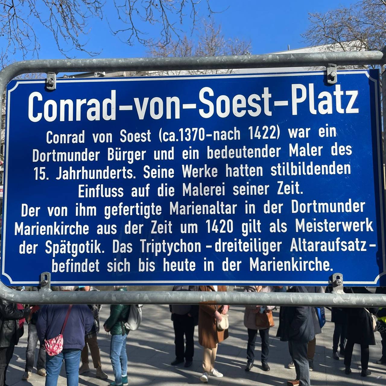 Conrad von Soest war nicht nur ein Dortmunder Bürger, sondern auch ein bedeutender Maler des 15. Jahrhunderts. Unter anderem hat Soest den Altar in der St. Marienkirche gestaltet, weshalb auch dieser Standort für die Benennung ausgewählt worden sei. Vor einem Jahr erlangte die Namensgebung besondere Aufmerksamkeit, weil die Satire-Partei „Die Partei“ gefordert hatte, den Platz in „Unser Omma ihr Platz“ zu benennen. Der Antrag wurde abgelehnt. Bislang war der Platz auf der Kleppingstraße neben dem Europabrunnen namenlos.