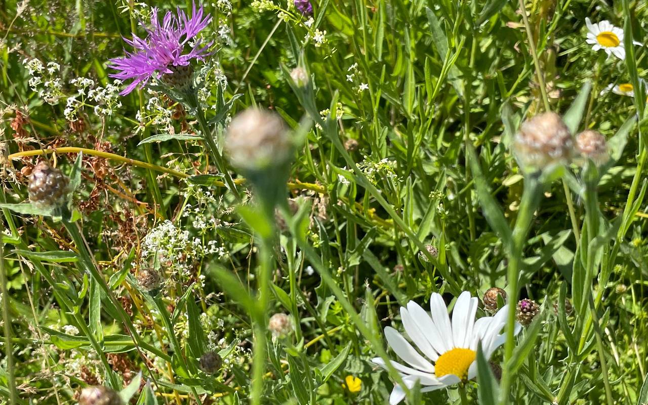 Überraschende Erkenntnis: Wilde Wiesen müssen ein bis zwei Mal im Jahr gemäht werden, damit sich dominate Gräser nicht durchsetzen und die Blumensamen verteilt werden. Was allerdings blöd ist: Das Heu ist noch nicht einmal als Tierfutter zu gebrauchen; dafür enthält es zu viele Hundehaufen, Papierschnipsel und anderen Dinge. Es landet am Ende warscheinlich in der Kompostieranlage.