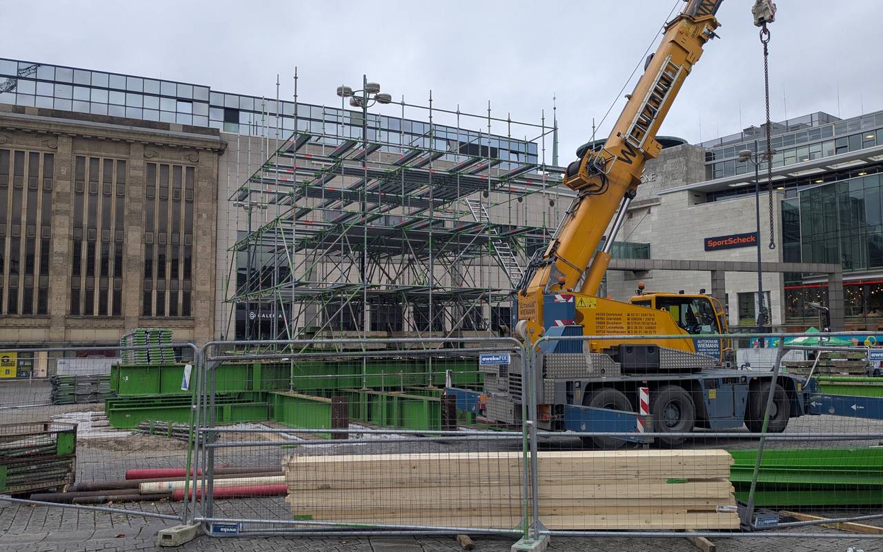 Die Gerüstbauer haben bereits ganze Arbeit geleistet und weit mehr als nur den Grundstein gelegt. 10 bis 15 Meter ragt das Gerüst für die Riesentanne schon in die Höhe. Bald werden die 1.700 Fichten angeliefert. Die Deko für den Weihnachtsbaum lagert noch in Containern. Der Engel auf der Spitze wurde aber schon getestet: er leuchtet noch. Viele Schaulustige haben bei der Grundsteinlegung in Dortmund auch ihren ersten Glühwein des Jahres getrunken. Noch aus alten Tassen, denn um die neuen wird traditionell noch ein Geheimnis gemacht.