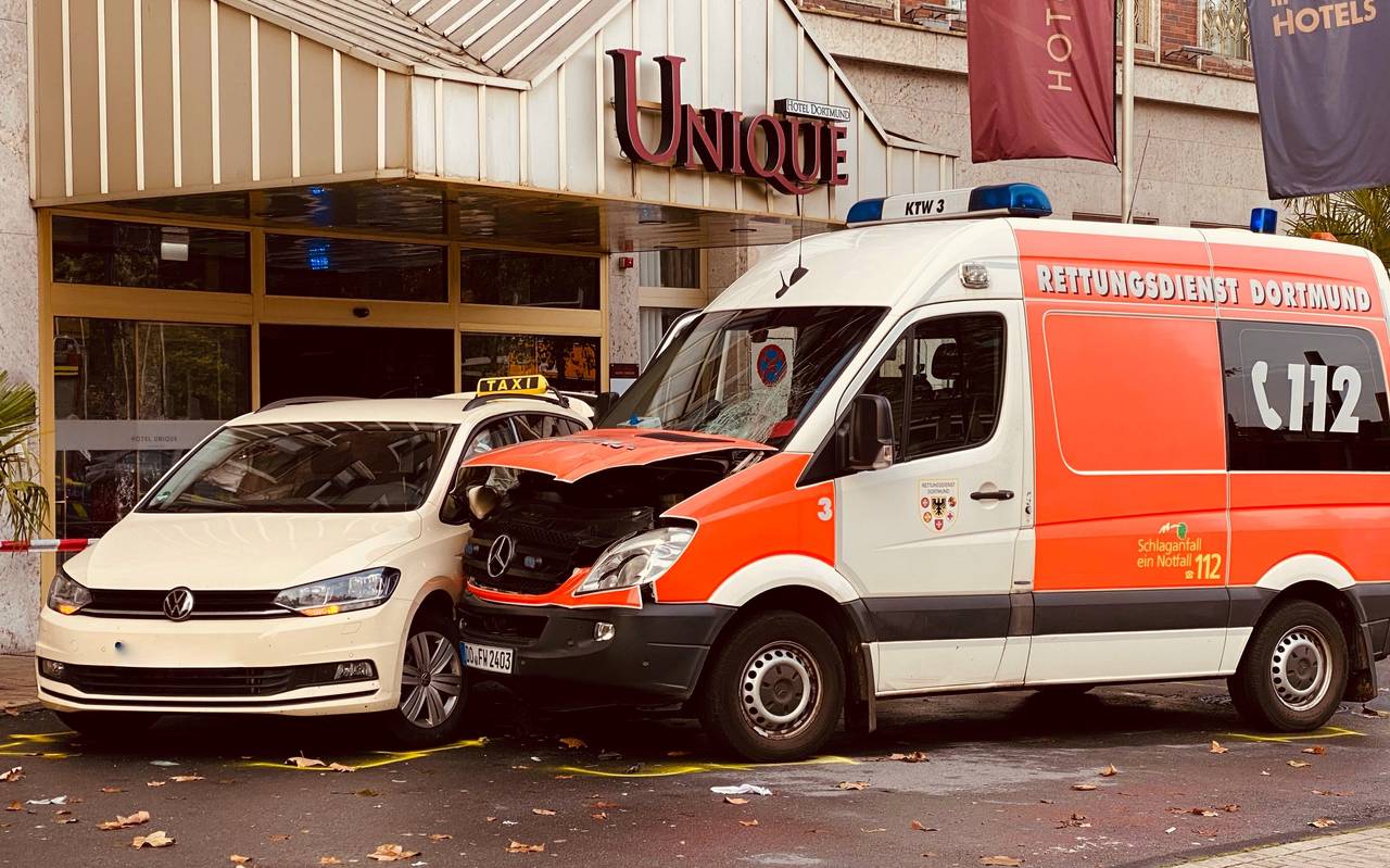 Ungewöhnlicher Unfall in Dortmund: Ein Krankenwagen des Rettungsdienstes Dortmund ist auf der Einfahrt des Hotels am Hohen Wall Ecke Rheinische Straße in ein Taxi gefahren. Passiert ist das am Freitagvormittag (13.10.) gegen 10.25 Uhr. Die Feuerwehr Dortmund spricht auf Nachfrage von Radio 91.2 von sieben beteiligten Personen.