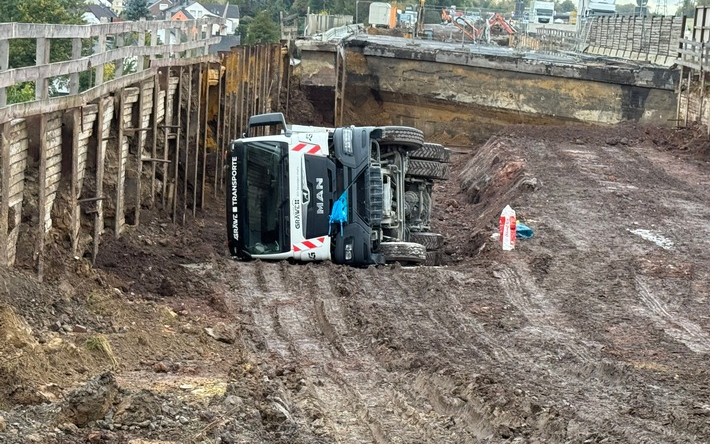 An der B1 ist ein LKW in eine Baustelle gekippt.