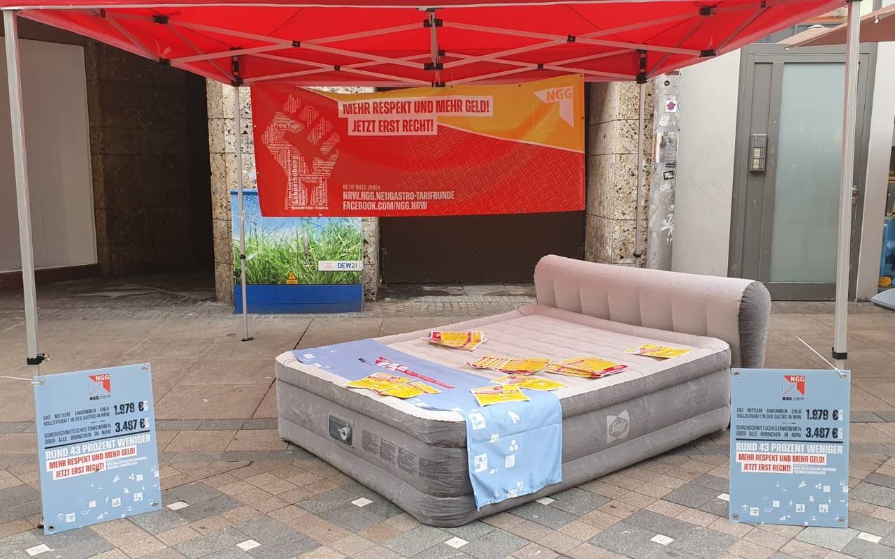 Am Mittwochmittag wurde ein ungemachtes Bett aufgestellt, als Zeichen für die Arbeit, die in der Branche seit Monaten nicht erledigt werden kann. Dazu hatte die Gewerkschaft Nahrung Genuss Gaststätten (NGG) aufgerufen. Hotels und Restaurants würden seit dem Ende des Lockdowns extrem unter Personalmangel leiden: Vom Koch, bis zum Kellner, von der Rezeptionistin bis zum Zimmermädchen.