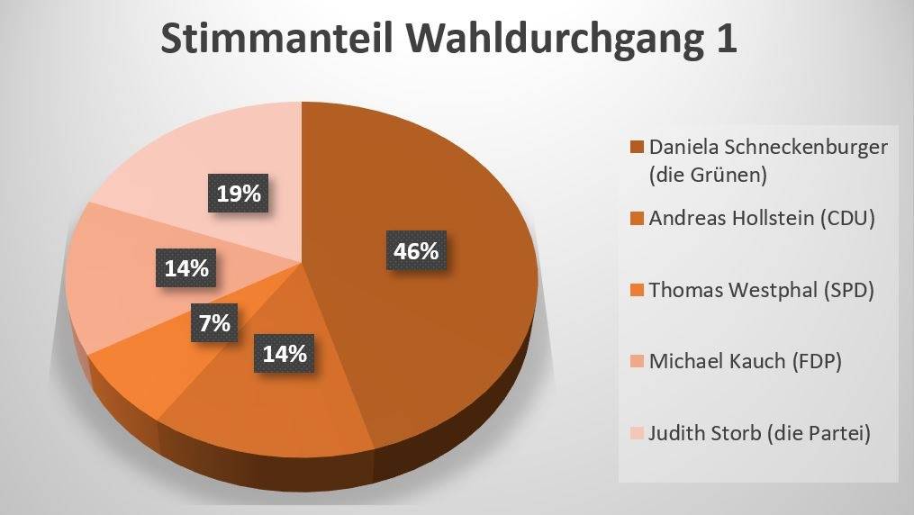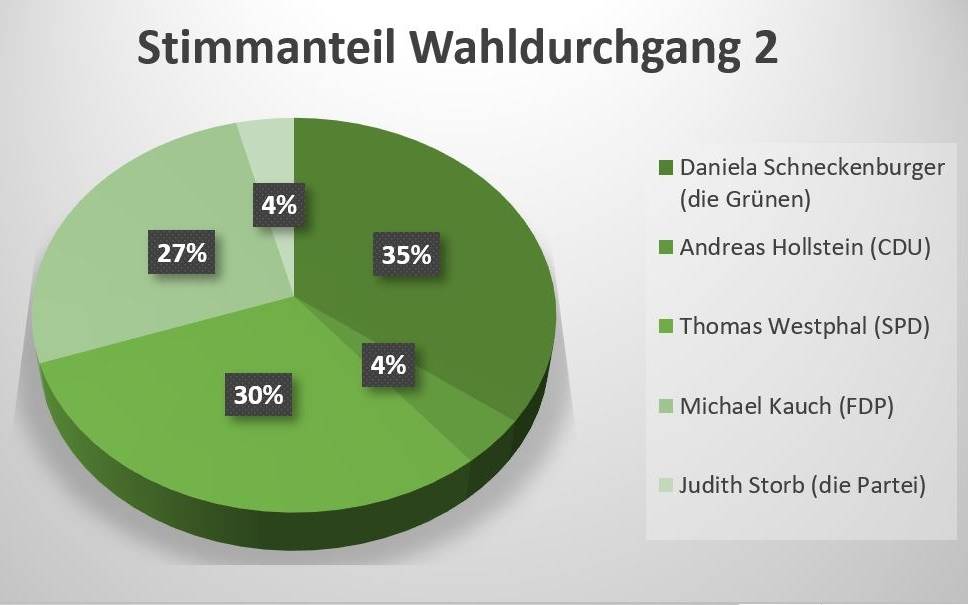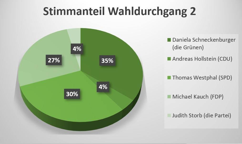 Vor der Podiumsdiskussion wählten die Schüler und Schülerinnen noch ihre/n Oberbürgermeister/in des Vertrauens. Diese Wahl wurde nach der Diskussion wiederholt. Dadurch änderte sich das Ergebnis erheblich. Bei beiden Wahldurchgängen war Daniela Schneckenburger die klare Siegerin. Thomas Westphal kam durch die Diskussion von 7% auf 31% der Stimmen.