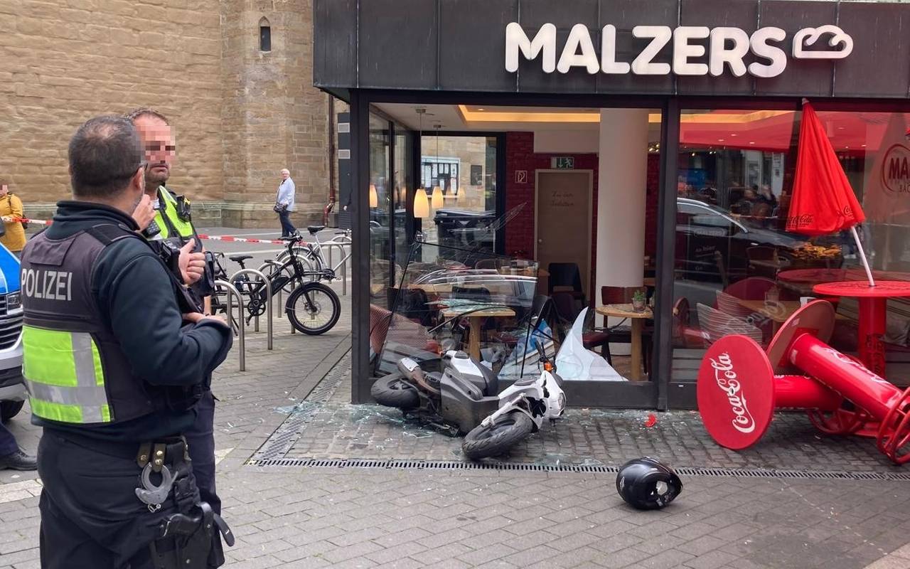 Mehrere Passanten waren dabei nach Angaben eines Polizeisprechers fast von dem Moped erwischt worden. Sie hätten sich teilweise mit einem Sprung gerade noch gerettet. Am Petrikirchhof war der Fahrer in ein Bäckereischaufenster gefahren. Dort wurde er von der Polizei Dortmund festgenommen. Der Fahrer wurde leicht verletzt und von Rettungskräften untersucht. Auch eine Frau wurde leicht verletzt. Sie saß in der Bäckerei, als das Moped in die Scheibe krachte.