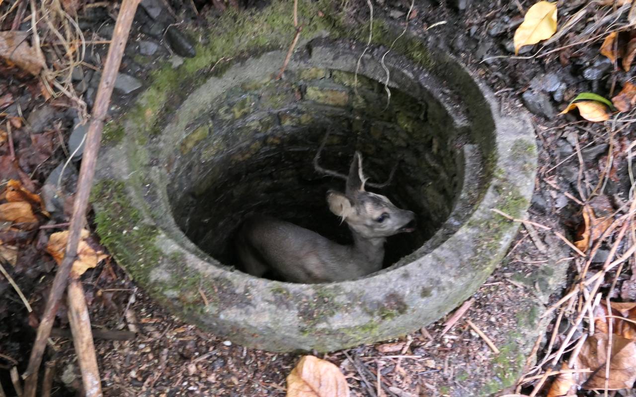 Weil der Schacht nicht so tief war, konnten zwei Feuerwehrleute das Reh packen und herausheben. Das Tier lief unverletzt in den Wald.
