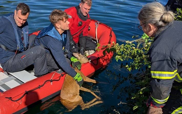 Dortmunder Feuerwehrleute haben heute Morgen (16. Mai) einem jungen Rehbock das Leben gerettet. Ein Spaziergänger hatte das Tier gegen halb 10 im Kanal im Dortmunder Stadtteil Ellinghausen entdeckt und die Feuerwehr gerufen. Südlich der A2-Brücke ließen die Retter ein Boot zu Wasser und machten sich auf den Weg zum Reh. Die Feuerwehrleute konnten das Tier am Kopf und Oberkörper fassen und sicher an Land bringen. Danach konnte der junge Rehbock unverletzt in den Wald laufen.