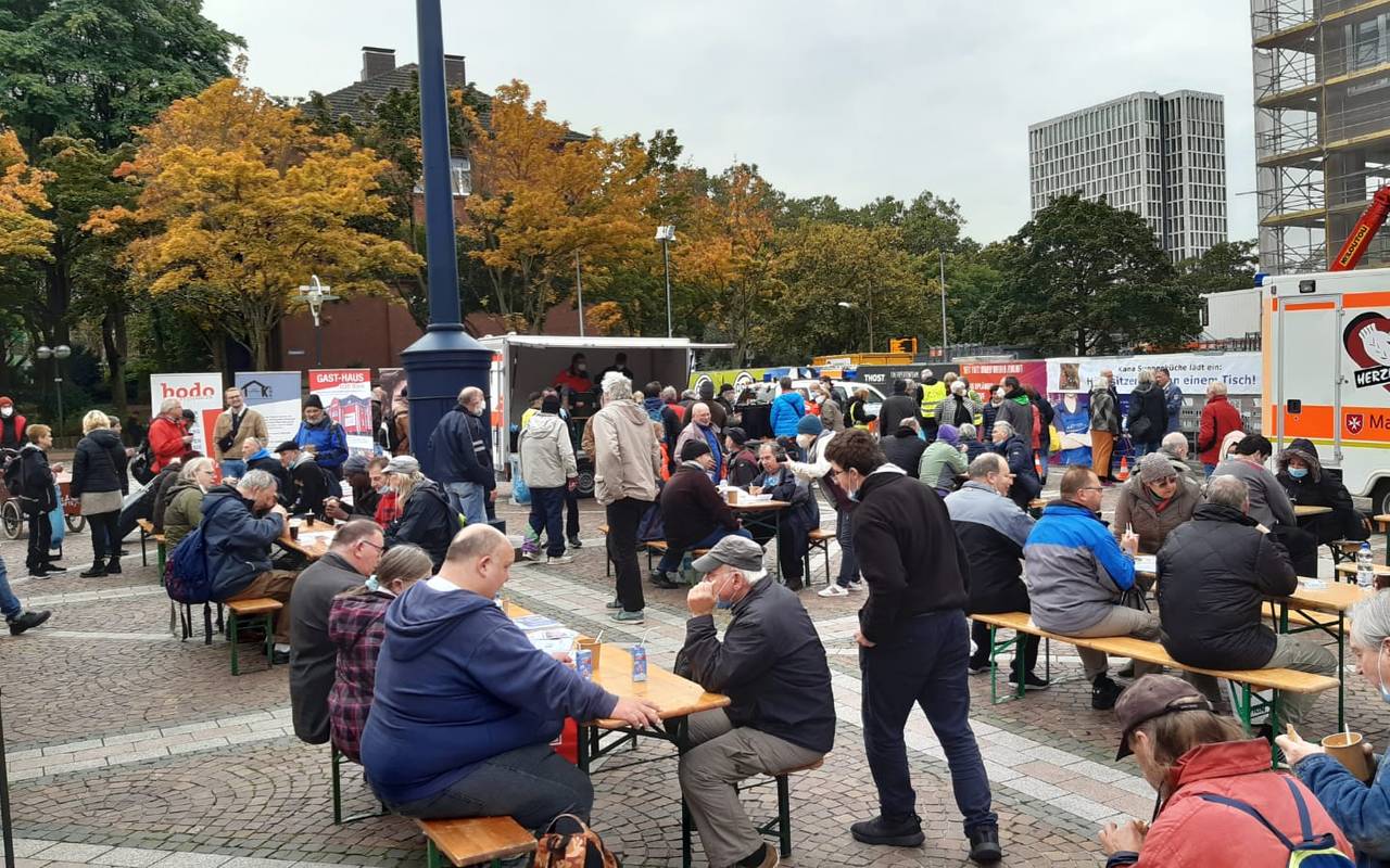Auf dem Friedensplatz in Dortmund haben am Sonntagmittag (18.10.) 200 Menschen zusammen zu Mittag gegessen, um so auf die Situation von Obdachlosen im Winter aufmerksam zu machen. Anlass dafür war der internationale Tag zur Beseitigung der Armut. Beteiligt an der Organisation der Aktion waren das Gast-Haus, die Kana Suppenküche, das Straßenmagazin bodo und ein Team des Herzensbusses.