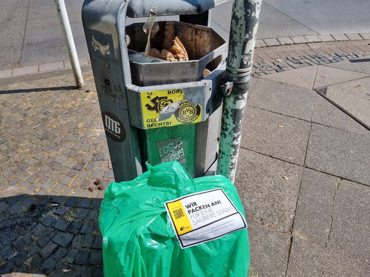 Müll, der kein Geld einbringt, sammelt Benjamin Fritzsch natürlich auch mit ein. Wenn die Tüte voll ist wird sie an einen öffentlichen Mülleimer gestellt. Dann kommt noch der Aufkleber der EDG drauf: "Wir packen an! Für eine saubere Stadt", damit die EDG weiß, welchen Müll sie abholen muss. Benjamin fotografiert die Tüte dann und meldet alles bei der "Dreckpetze" - eine App der EDG. Dort wird auch der Standort eingetragen. Nach kurzer Zeit erhält er dann häufig die Meldung, dass der Müll abgeholt wurde.