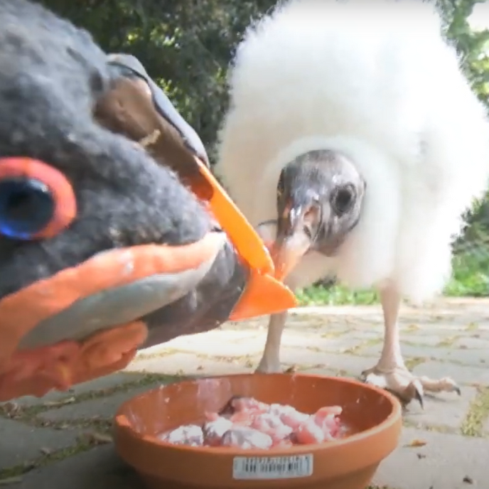 Die Königsgeier im Dortmunder Zoo haben Nachwuchs. Ende Februar ist der kleine Viktor zur Welt gekommen und hat ordentlich Kohldampf. Das Besondere ist, dass er nicht von seinen Eltern aufgezogen wird, sondern von einer Handpuppe.