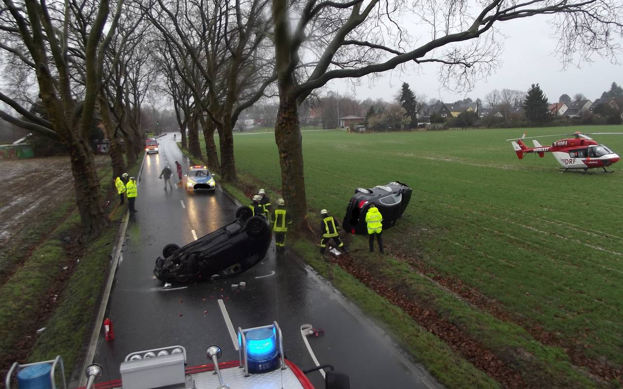 Ein 52-Jähriger Autofahrer aus Gelsenkirchen musste ausweichen und kam dabei ebenfalls von der Straße ab. Sein Auto prallte ebenfalls gegen einen Baum, geriet in den Straßengraben und überschlug sich. Bei dem Unfall wurden die Dortmunderin und der Gelsenkirchener sowie sein 43-jähriger Beifahrer schwer verletzt.