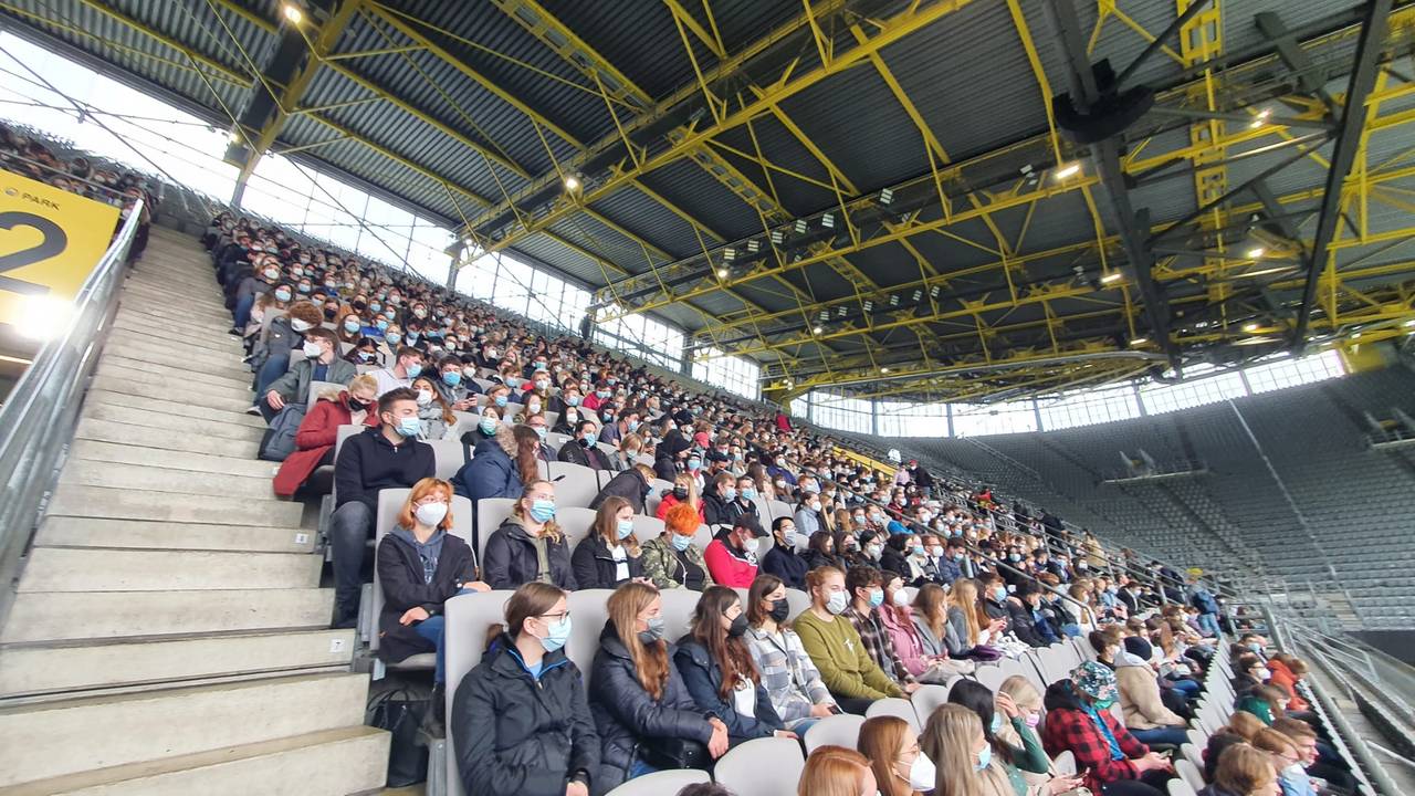 Die TU Dortmund hat nach einem Jahr Corona-Pause rund 4.700 Erstsemester im Signal-Iduna-Park begrüßt. Auch Oberbürgermeister Thomas Westphal hieß die Studierenden per Videobotschaft willkommen. Bei allen Anwesenden im Stadion war die Freude sichtlich groß, sich persönlich sehen zu können.