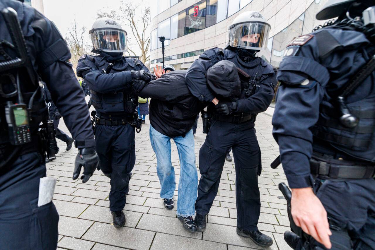 Polizeibeamte überwältigen einen Mann am Rande einer AFD-Kundgebung und Gegenprotesten.