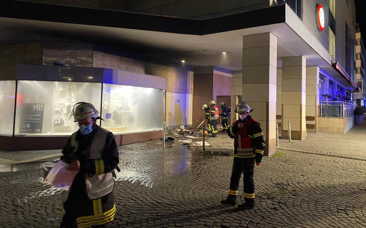Durch die Hitze der Flammen platzte laut Feuerwehr auch die Scheibe eines Schaufensters. Zudem löste in dem Gebäude die Sprinkleranlage aus.