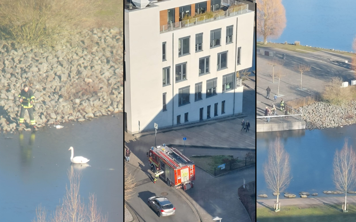 Ungewöhnlicher Einsatz der Feuerwehr Dortmund am Phoenixsee: Da ist offenbar ein Schwan auf dem See festgefroren.