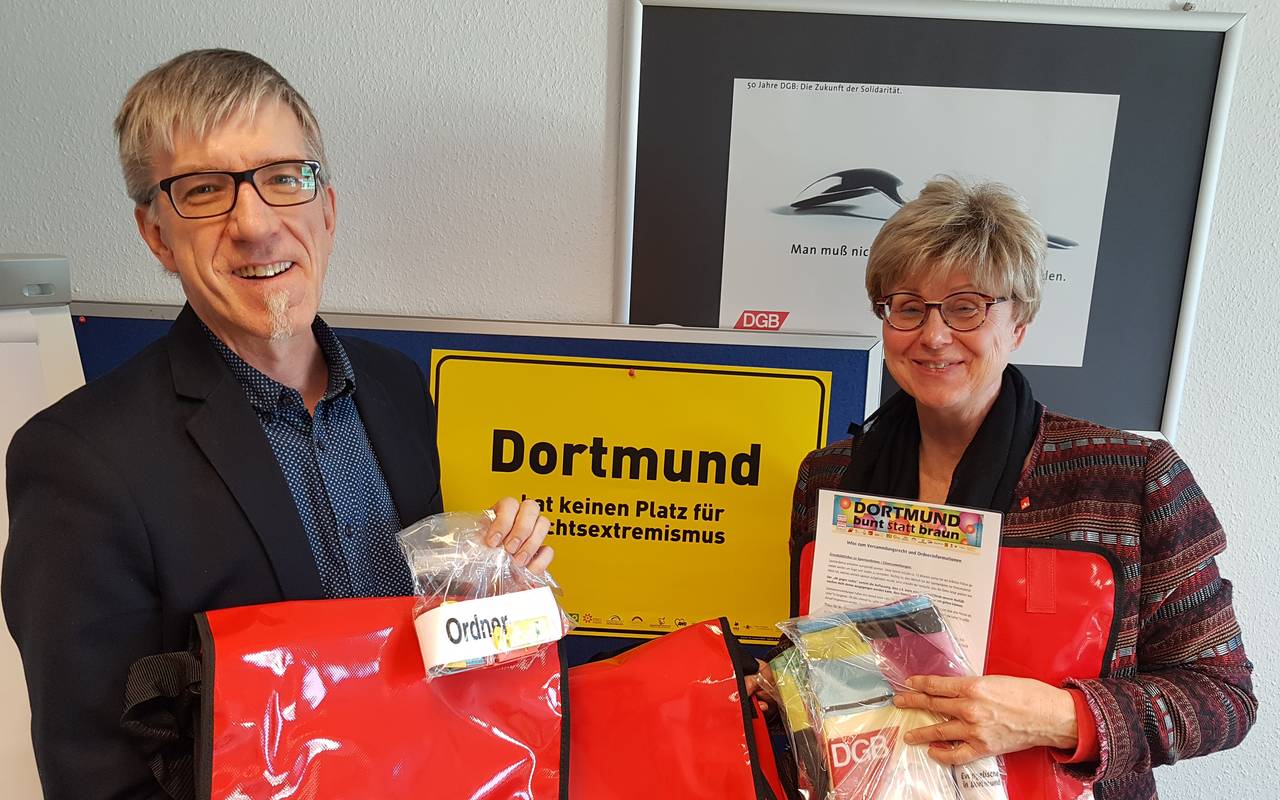 Der Arbeitskreis gegen Rechtsextremismus hat eine Notfalltasche "Bunt statt Braun" kreiert. Die Tasche selbst ist rot und wurde von Jutta Reiter aus dem Arbeitskreis gegen Rechtsextremismus vorgestellt.