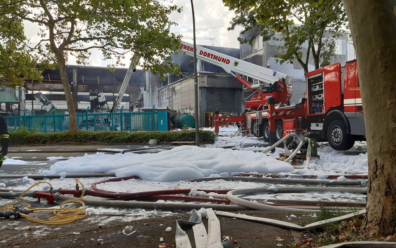 Das Feuer war am frühen Sonntagmorgen (6.9.) gegen 3:15 Uhr in einer Lagerhalle auf dem Brümmer in Dorstfeld ausgebrochen. In den Hallen wurden nach Angaben der Feuerwehr Hardware-Produkte für Computer gelagert.