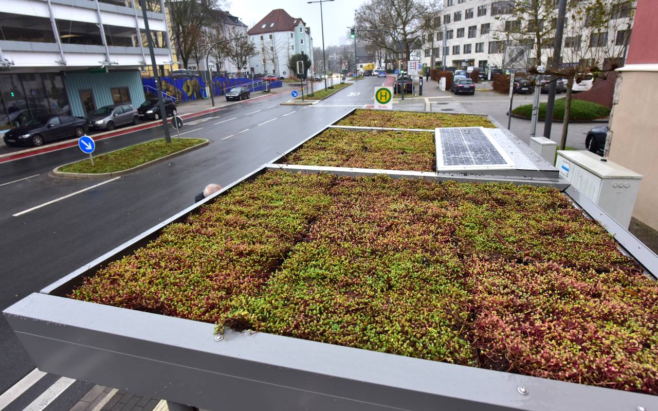 Wo in Dortmund könnte man noch Dächer begrünen und Photovoltaikanlagen aufstellen? Auf den Wartehäuschen der Bus- und Bahnhaltestellen wäre noch Platz. Die ersten zehn Dächer von Wartehäuschen werden jetzt von der DSW21 in einem Pilotprojekt begrünt. So sollen sie Platz für Insekten bieten - und Regenwasser auffangen und verdunsten und damit das Klima im Umfeld verbessern. Die Mini-Photovoltaikanlagen auf dem Dach liefert den Strom für die Beleuchtung.