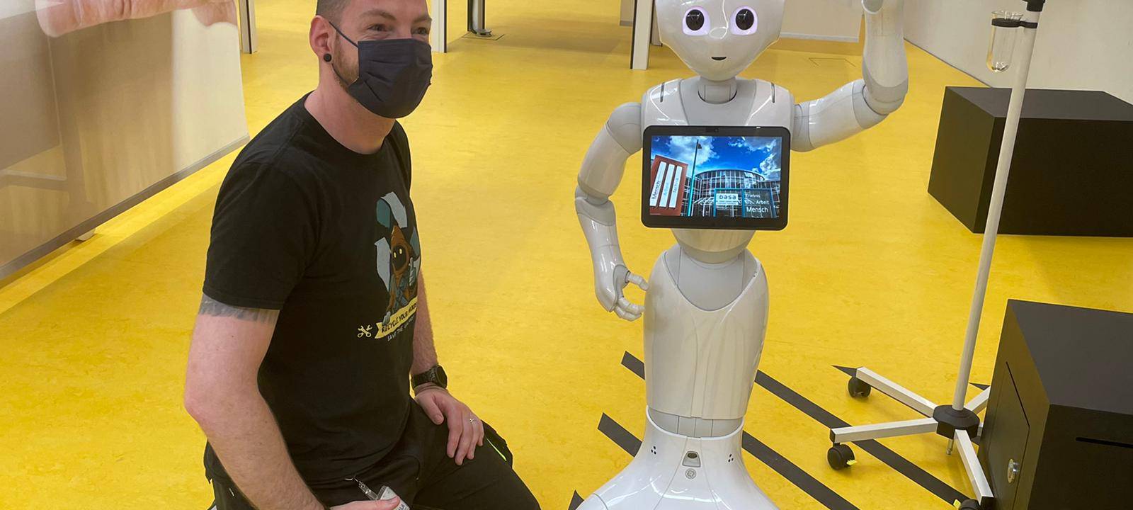 Pepper ist ein Roboter aus weißen Hochglanz-Plastik, ist circa 120 Zentimeter hoch und ist mit beweglichen Armen, Kopf sowie großen schwarzen Kulleraugen ausgestattet. Er wird in Seniorenheimen eingesetzt und kann z.B. Lieder singen. Auf einem Display können wir Fragen eingeben und genauso auch den Roboter berühren.