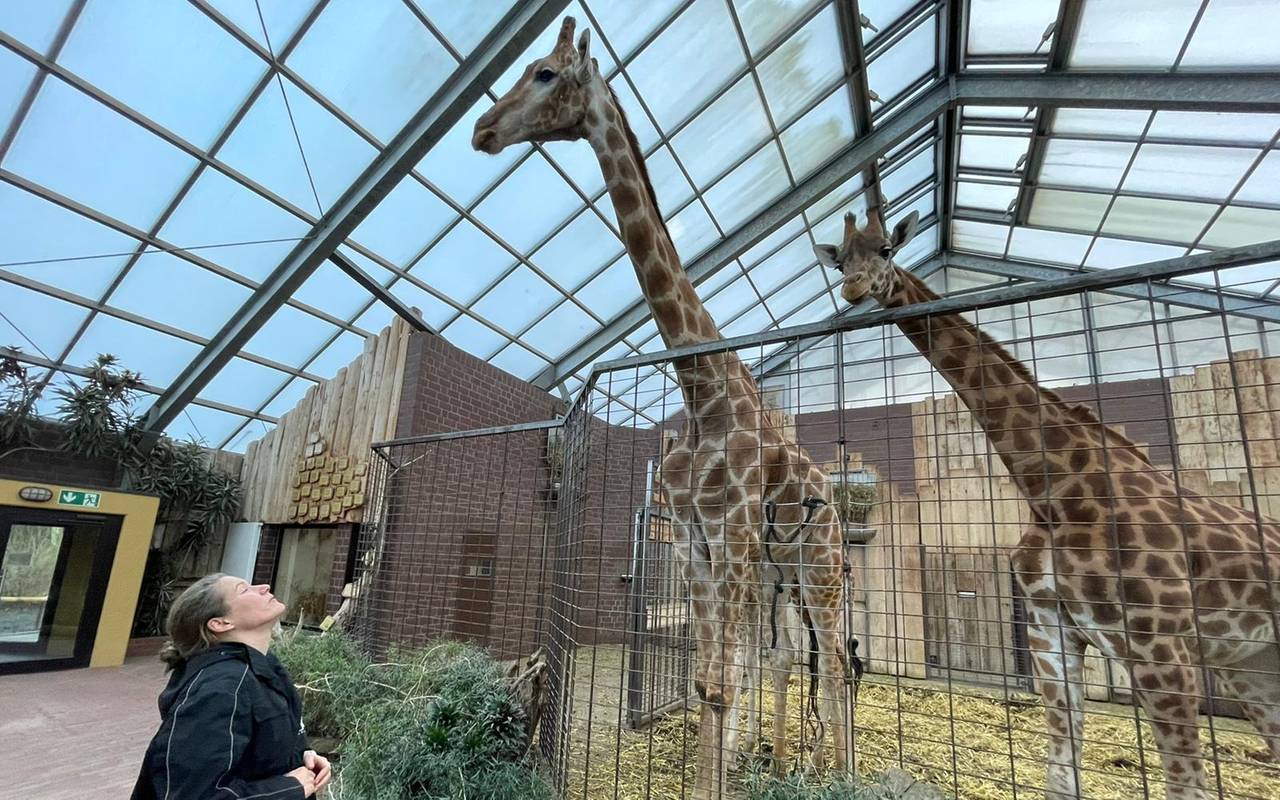 Lennart Beissner und Wiebke Dreesmann kontrollieren das Giraffen-Gehege und schauen, wie es den drei Giraffen im Dortmunder Zoo geht.