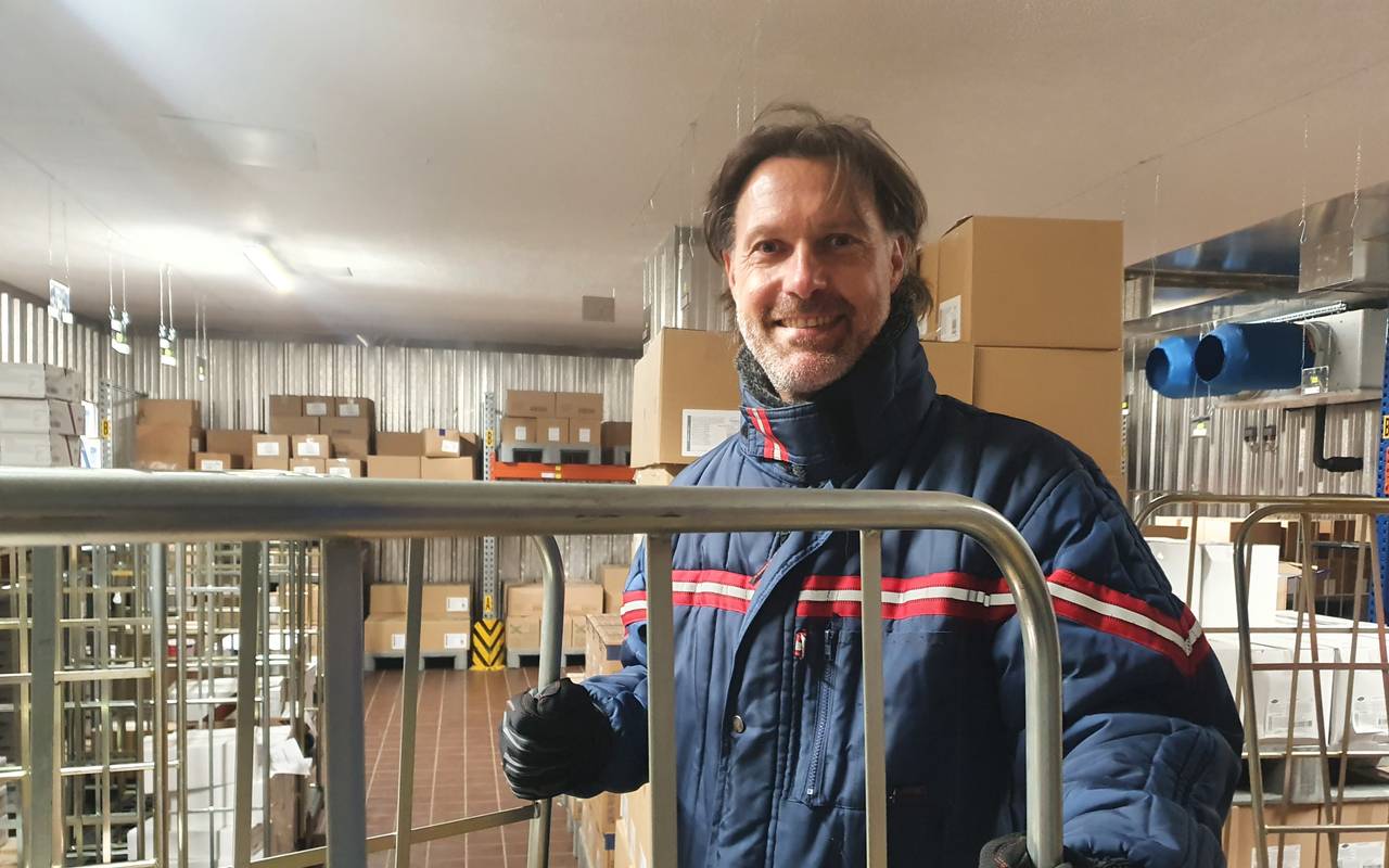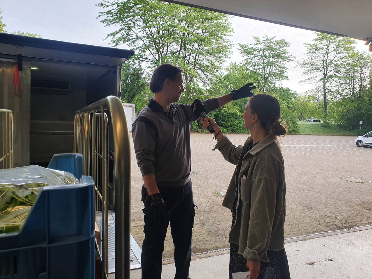 Dirk arbeitet seit 10 Jahren im Zentrallager des Studierendenwerks. Der Fleischlieferant bringt Putengyros ins Lager. Nach Anlieferung wird das Fleisch kontrolliert.