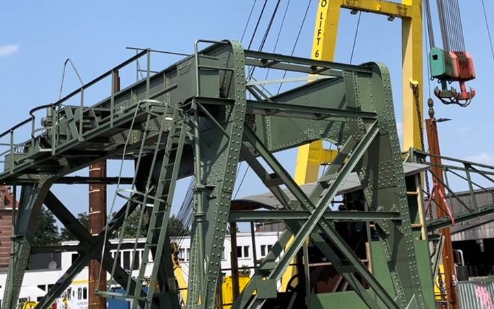 Der Kran musste, in mehrere Teile zerlegt, über eine Brücke hinweg auf zwei Transportschiffe gehoben werden. Eins der beiden Schiffe hatte den Unterbau geladen, allein der wiegt schon 37 Tonnen. Trotzdem musste das Schiff sogar noch jede Menge Wasser zuladen, sonst hätte es nicht unter der Kanalbrücke am Alten Hafenamt hindurchgepasst. Ein Schwimmkran war extra aus Rotterdam angefordert worden, um das historische Denkmal dann am Hafen aufzustellen.