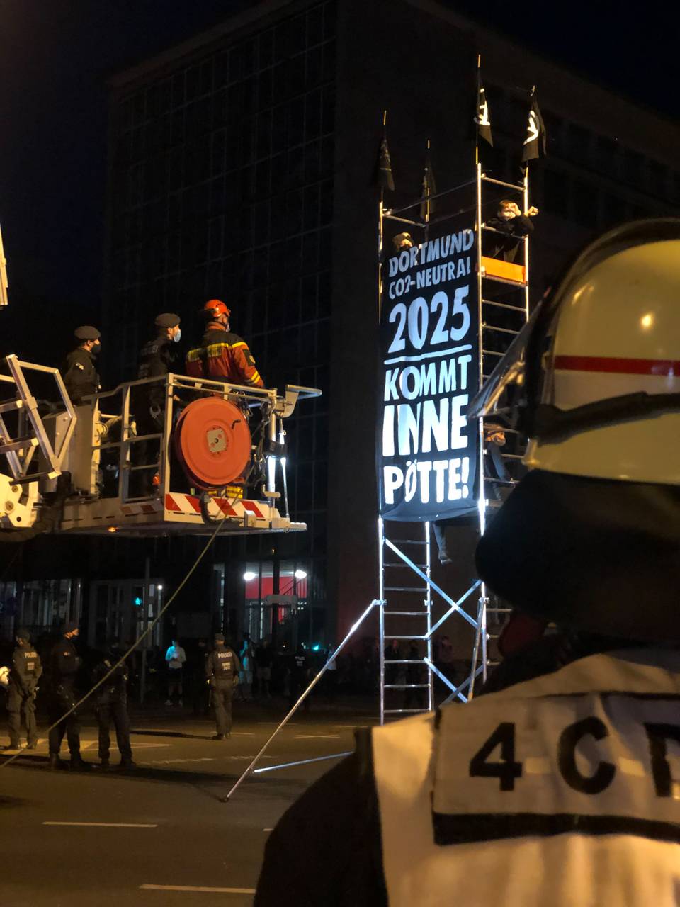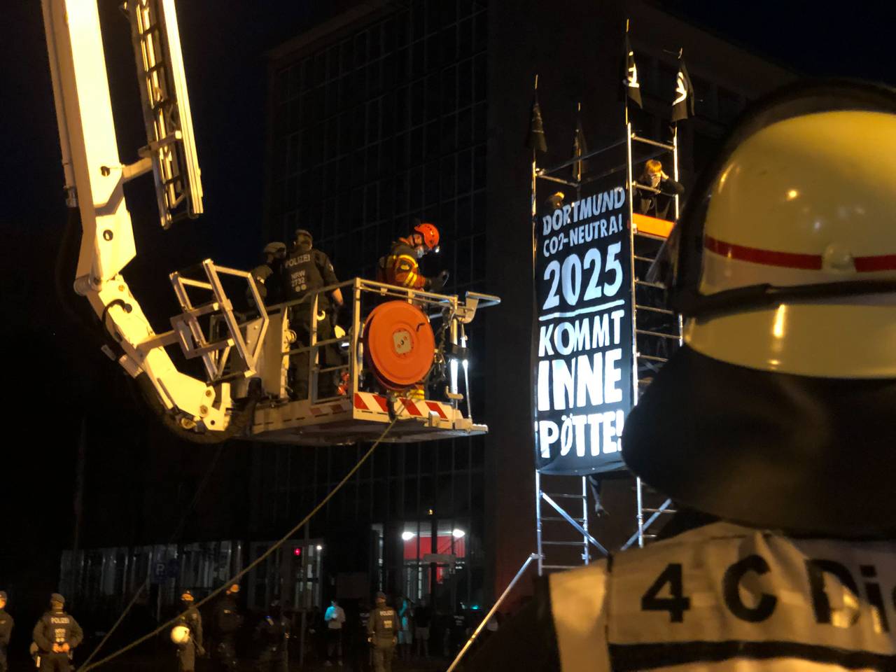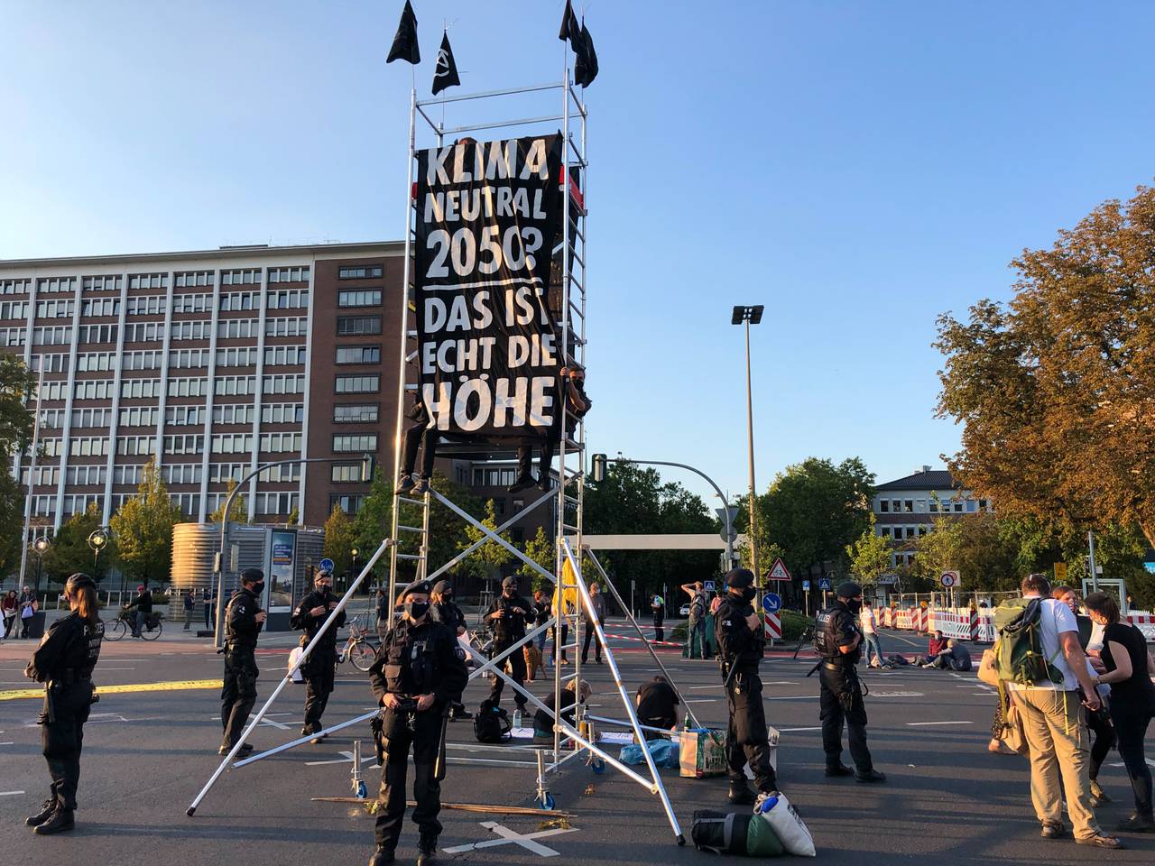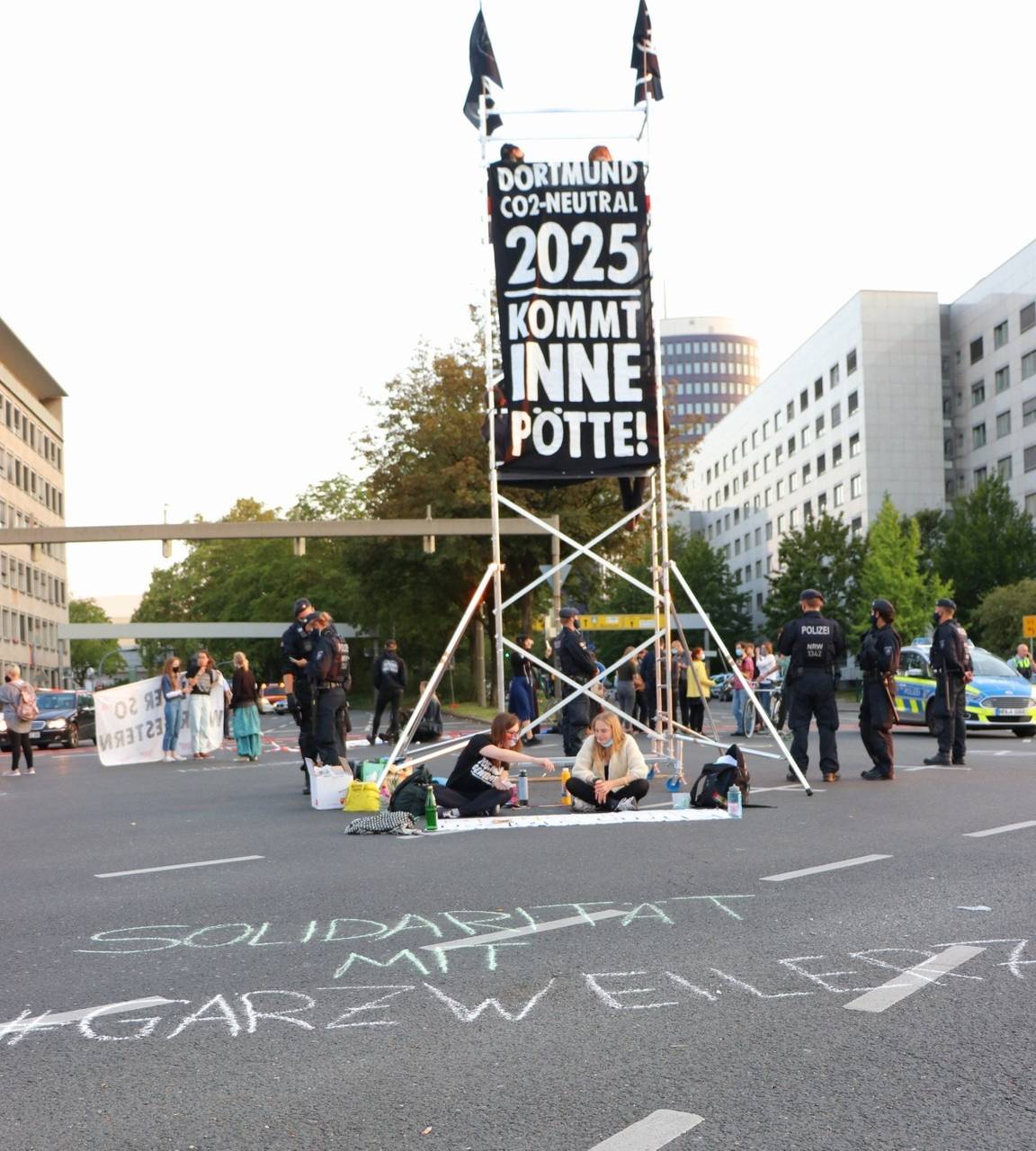 Zunächst hatten sich einige der Aktivisten mit Absperrband und Plakaten versammelt und so die Kreuzung blockiert. Dann wurde ein Gerüst aufgebaut, auf dem sich mehrere Demonstranten in etwa sechs Metern Höhe angekettet haben.